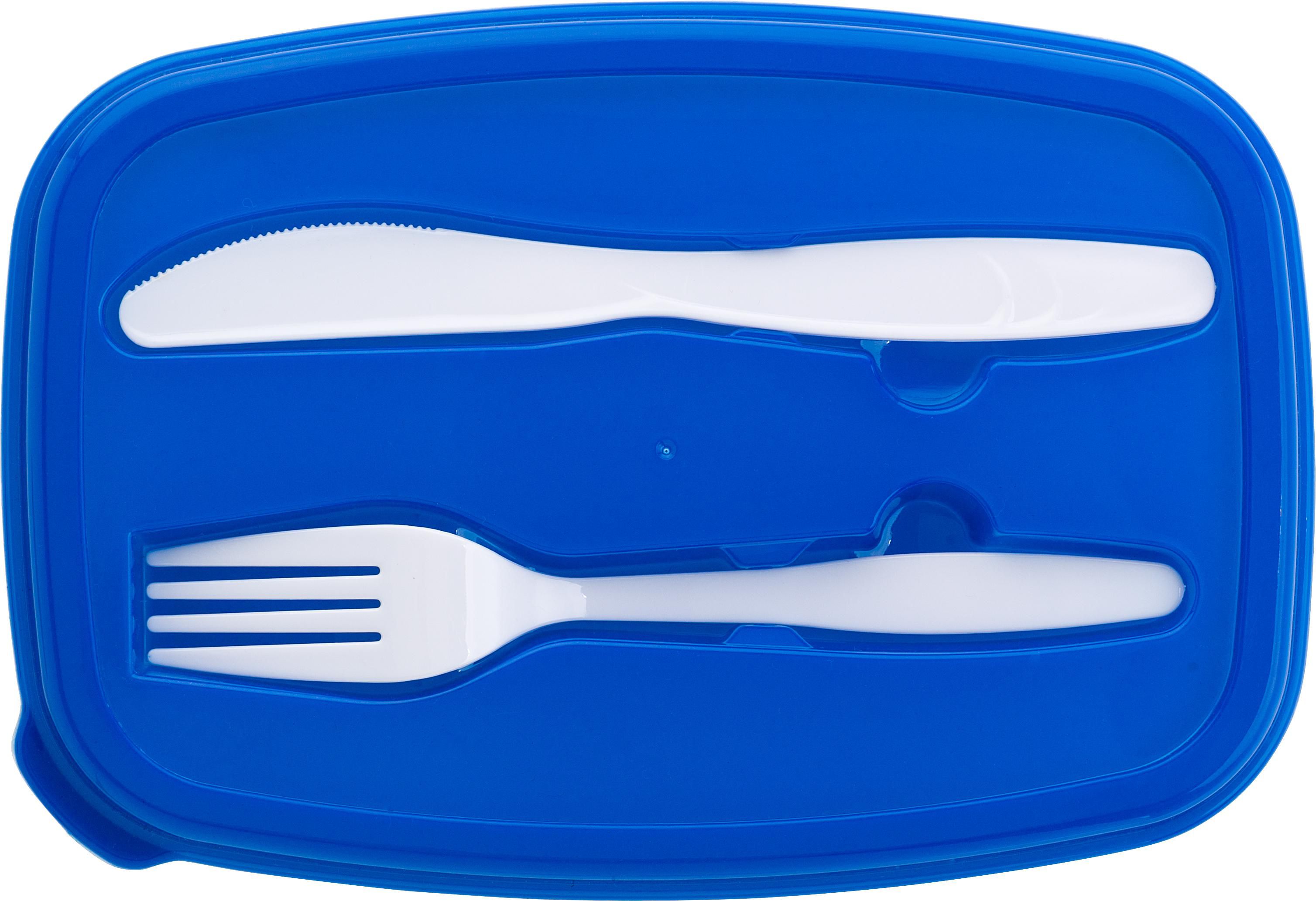 Pochette isotherme en polyester 420D contenant une lunch box compartimentée en plastique, livrée avec fourchette et couteau.