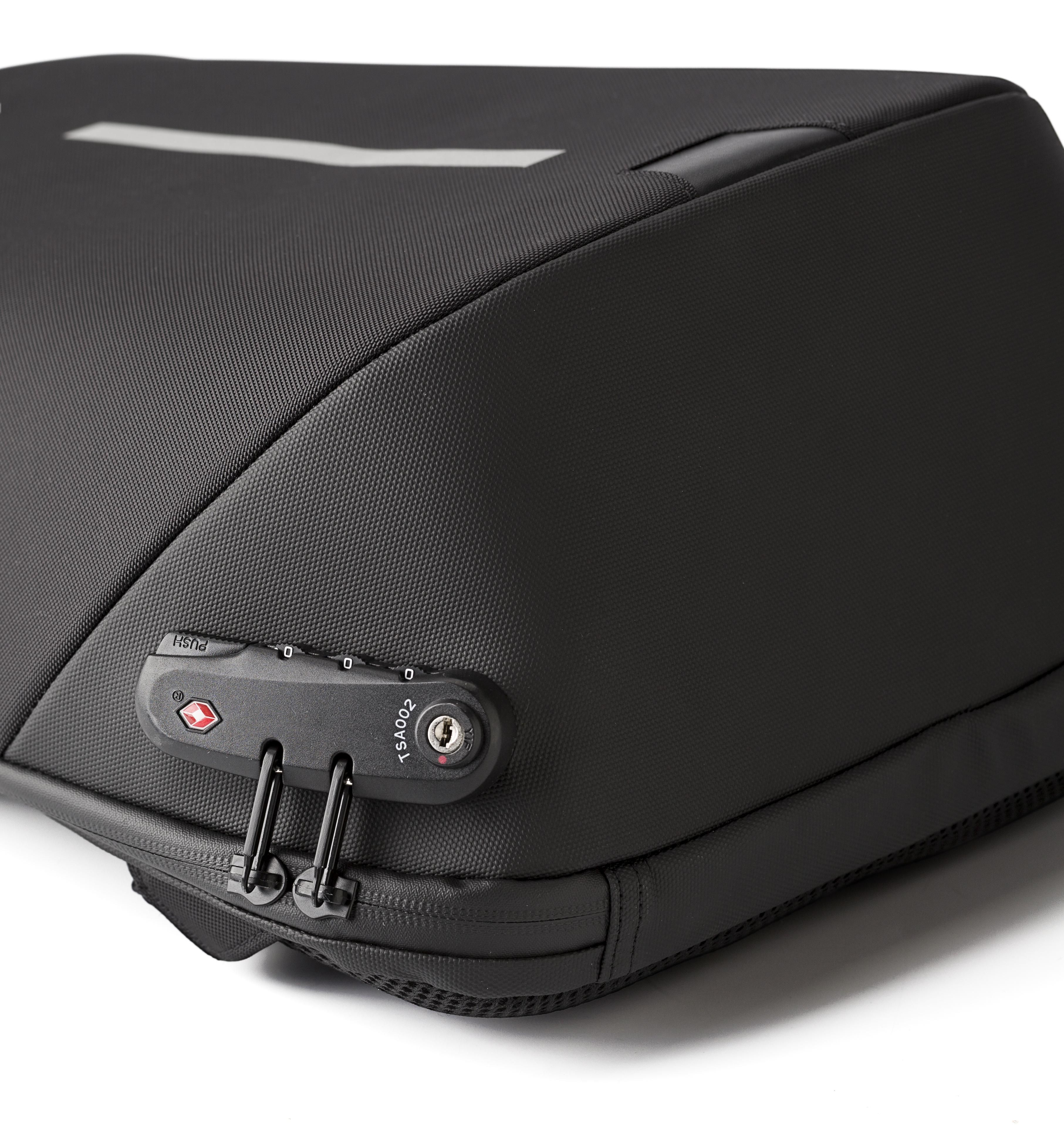 Sac à dos antivol porte-ordinateur de 15'' en nylon 1 200D avec coque semi-rigide, port USB latéral avec câble, serrure TSA, sangles élastiques allégeant le poids, dos matelassé moulé et poignée en métal.