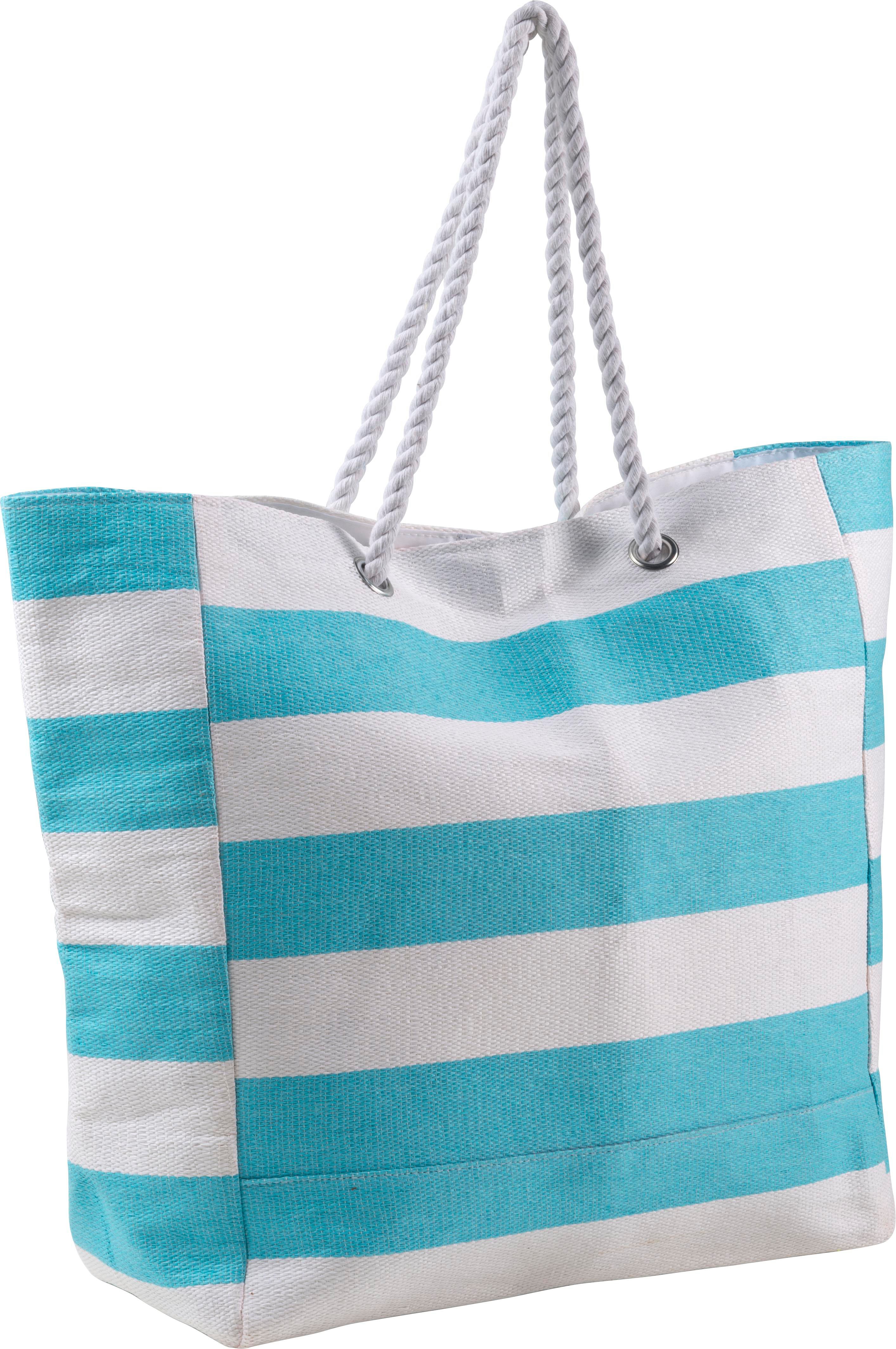 Sac de plage en polyester avec fermeture magnétique et anses en corde.