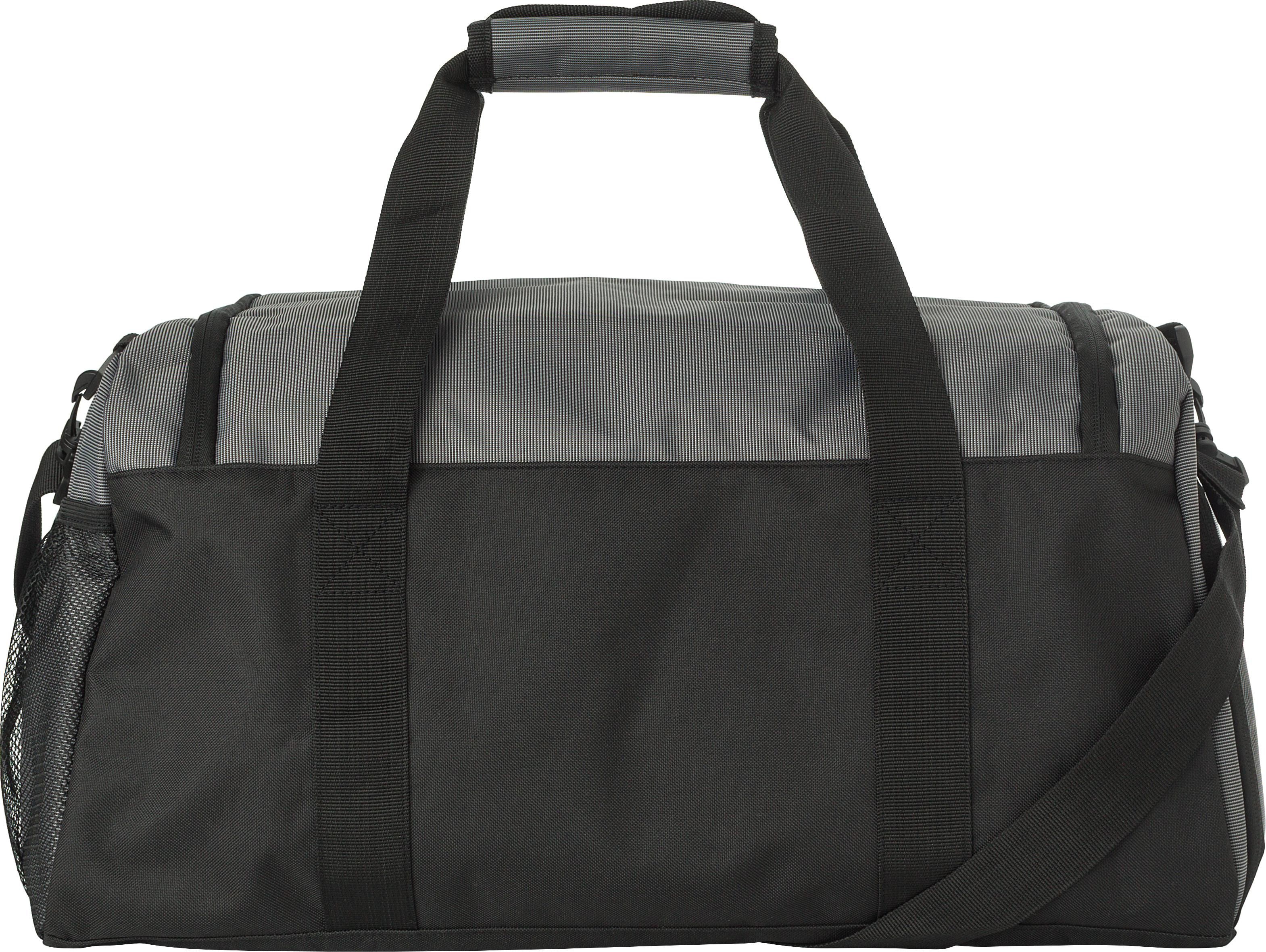 Sac de sport en polyester 600D avec compartiment chaussures ventilé, poche latérale filet et renfort dans le fond.