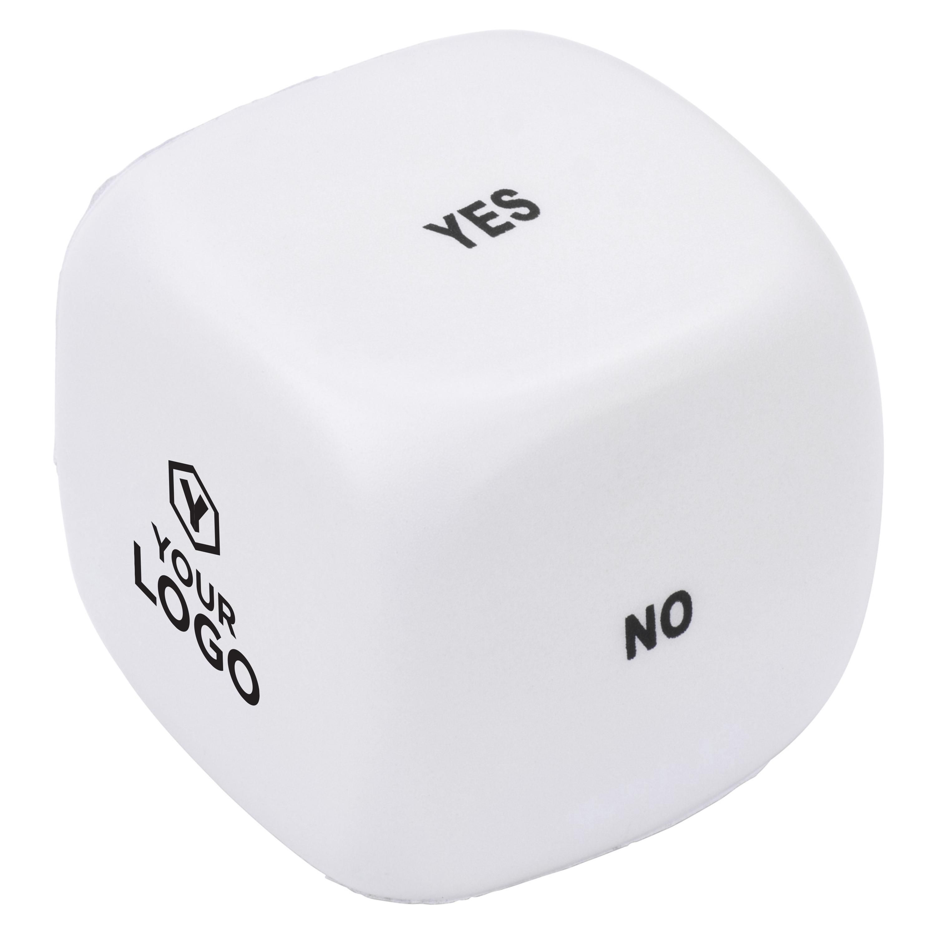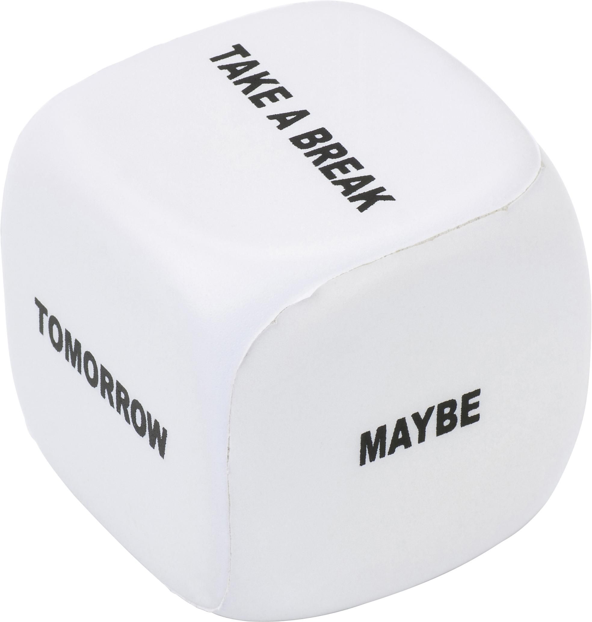 Anti-stress 'dé' en PU. Marquage en noir, blanc ou argent. Les anti-stress ne peuvent être marqués qu'en noir, en blanc ou en silver, en Or.