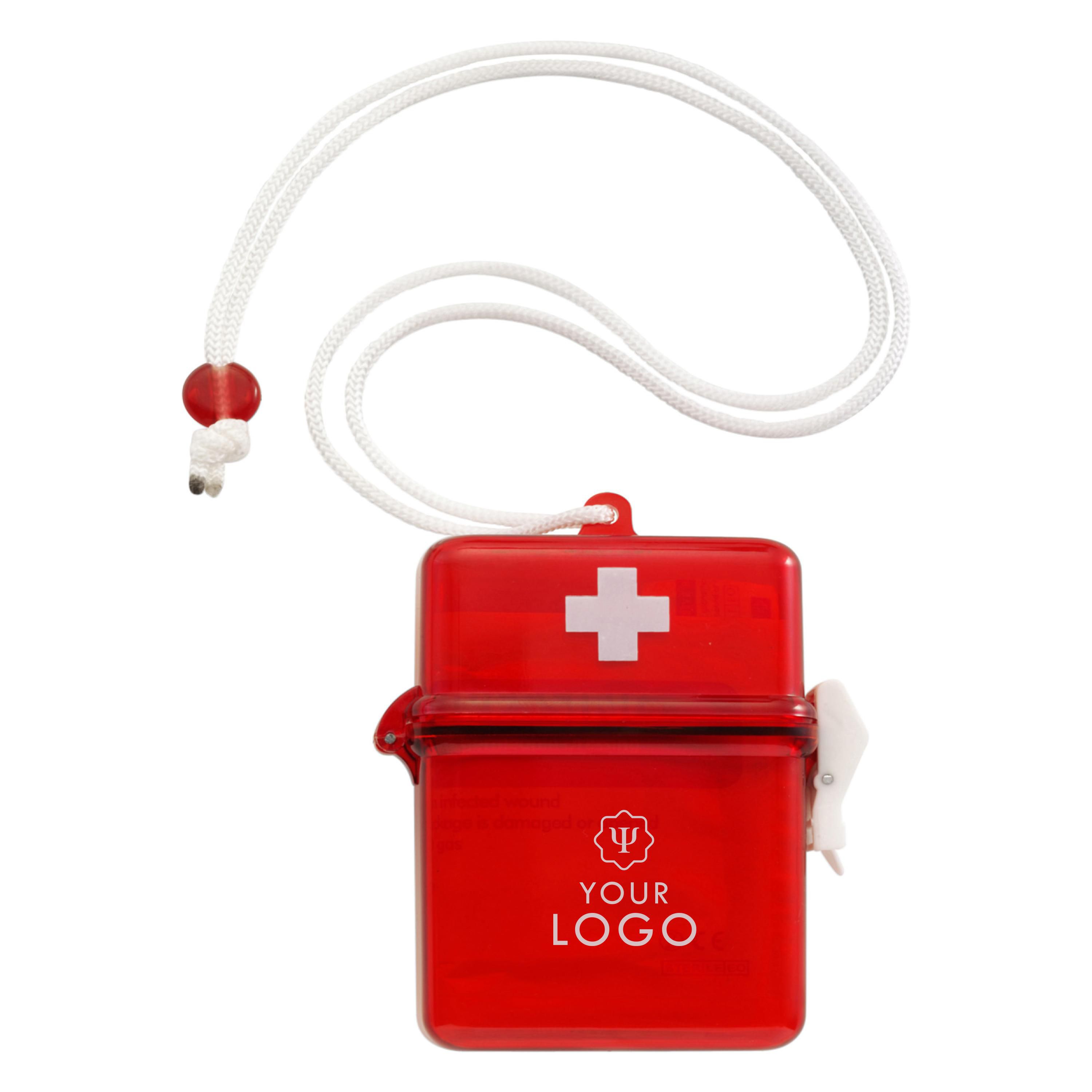 Kit de premiers secours livré dans une boîte en plastique waterproof comprenant pansements stériles, rubans adhésifs, alcool et lingette anti-moustique.