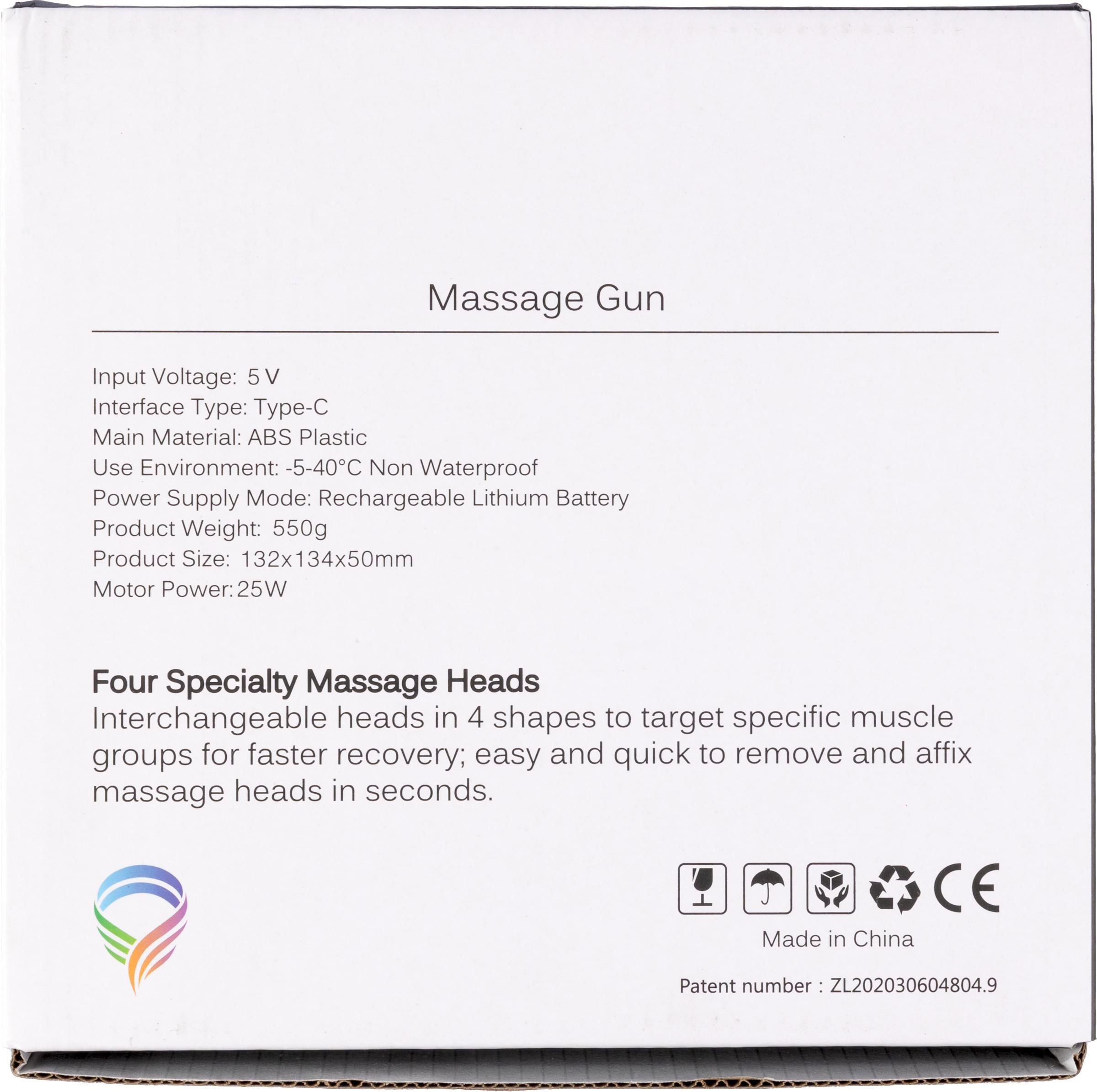 Pistolet de massage en ABS d’une puissance de 1.800 – 3.200 tr/min équipé d’une batterie rechargeable de 1.200 mAh. Entrée 5V et 6 niveaux d’intensité pour masser les muscles. Emballé individuellement par pièce dans un coffret cadeau, comprenant 4 têtes de massage.