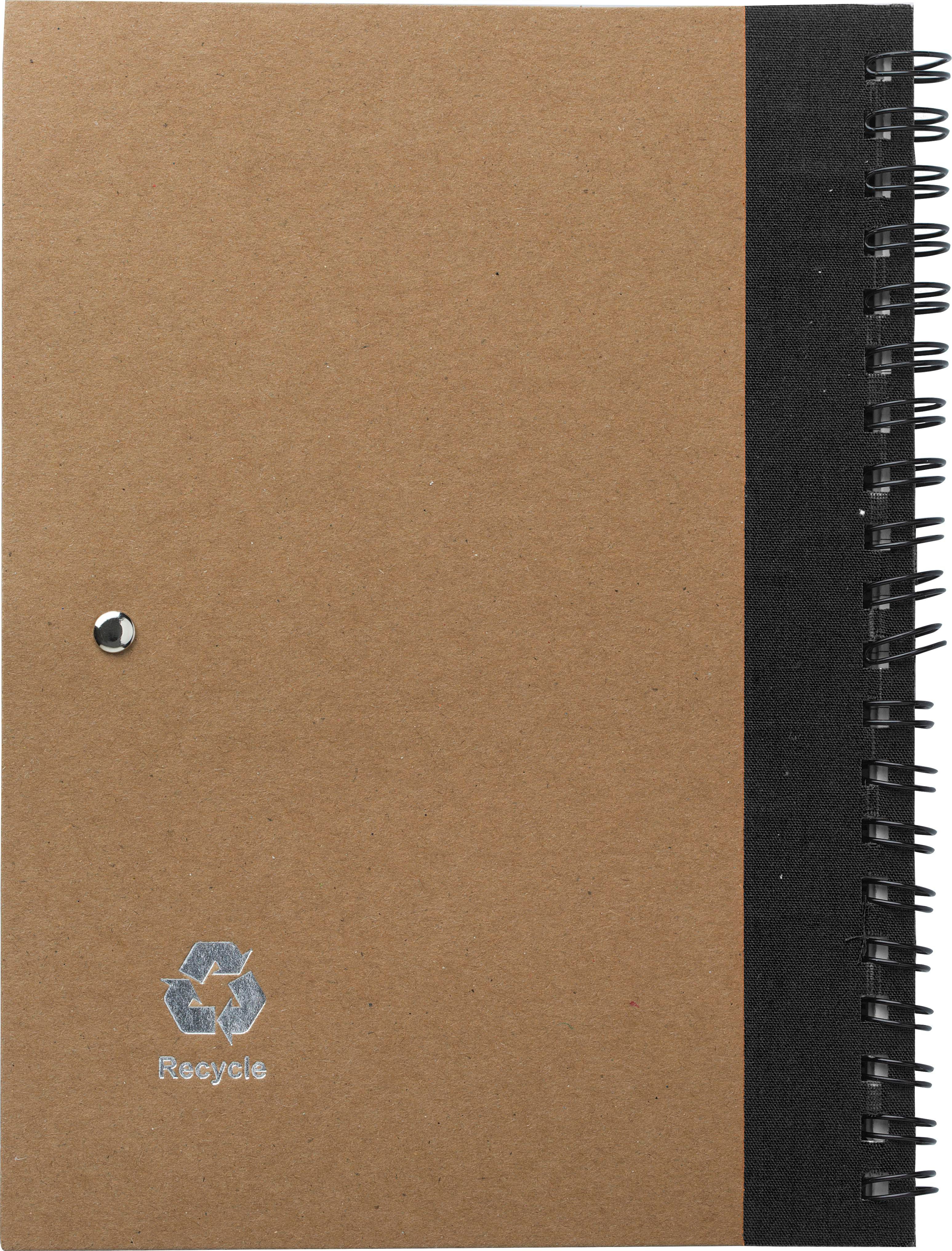 Carnet à spirale en carton et papier recyclés contenant environ 60 feuilles lignées, livré avec stylo bille recyclé, mine bleue.