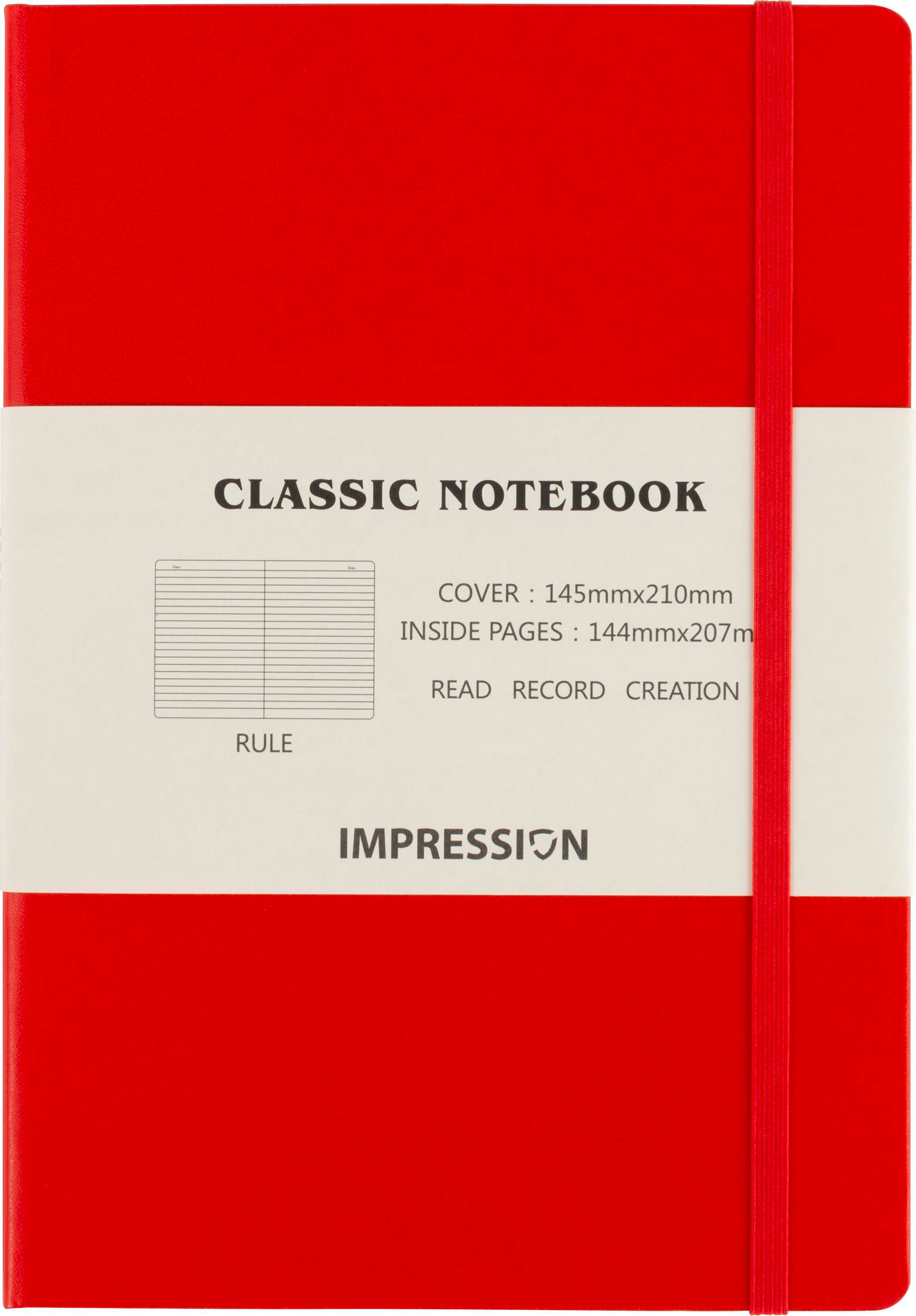 Carnet A5 avec couverture cartonnée contenant 128 feuilles lignées avec fermeture élastique et marque-page, pochette cartonnée sur la 3ème de couverture, 'Impression' en embossage sur la 4ème de couverture.
