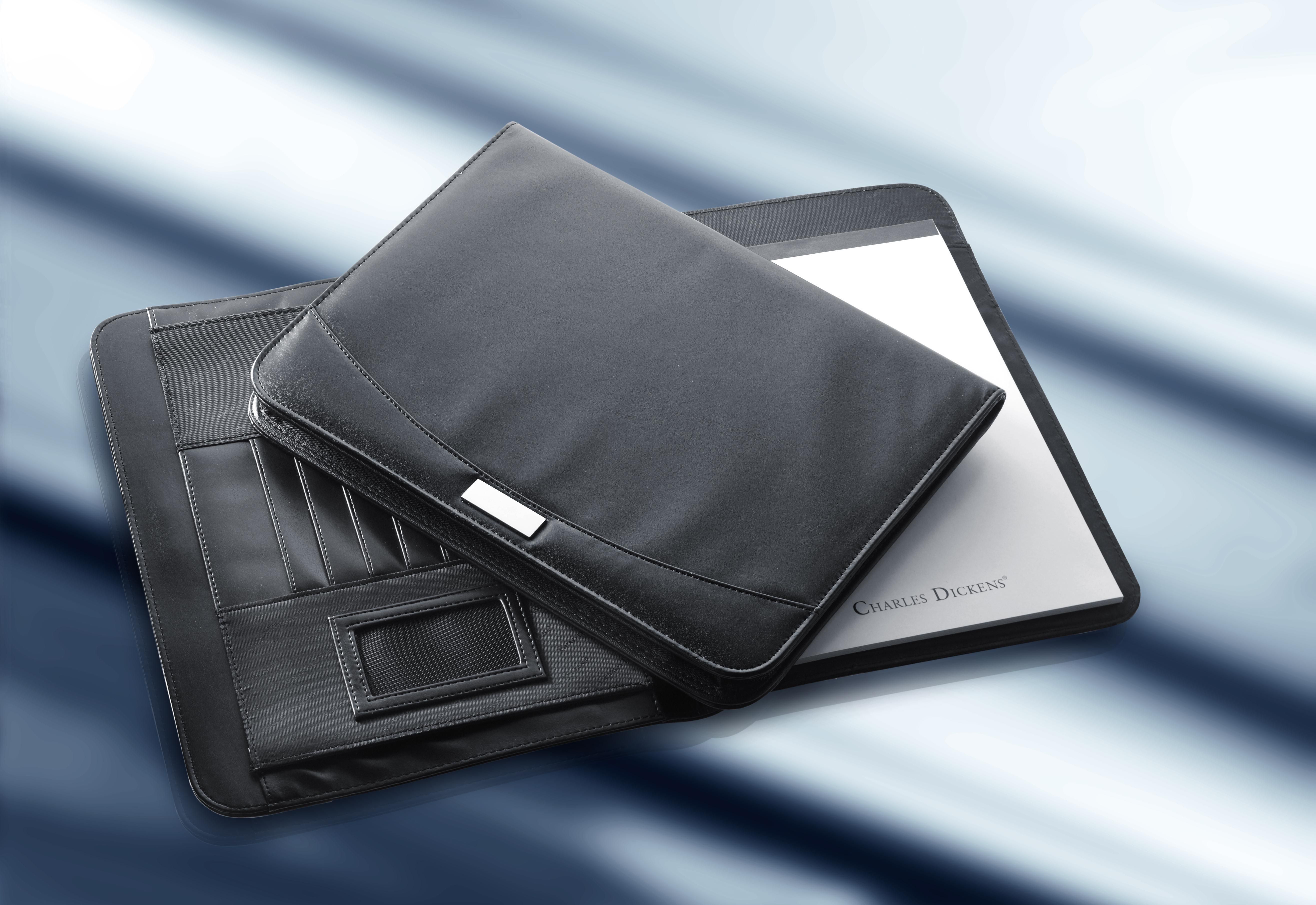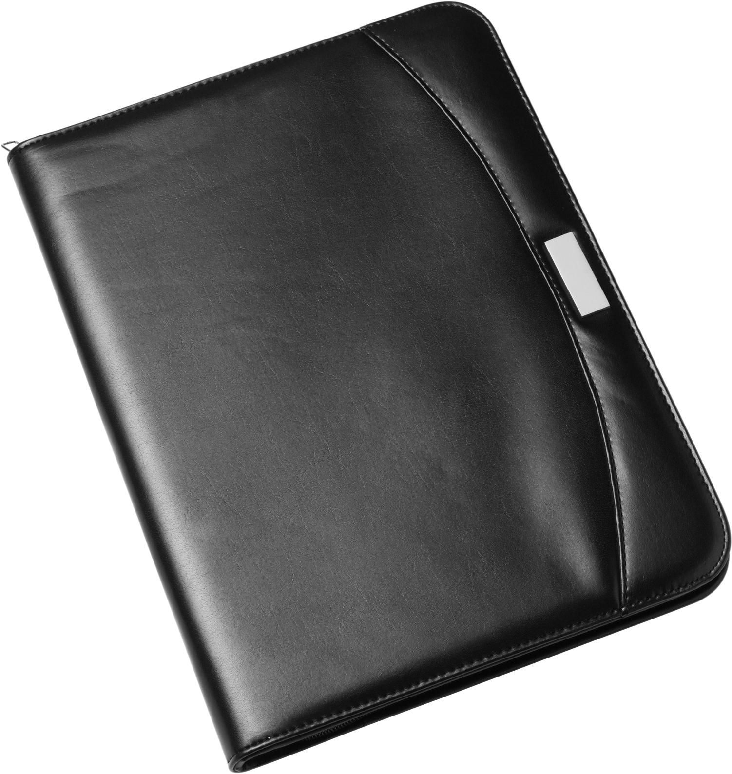 Conférencier A4 zippé en PU Charles Dickens® muni d'une plaque métallique, livré avec bloc-notes et calculatrice, sans stylo.