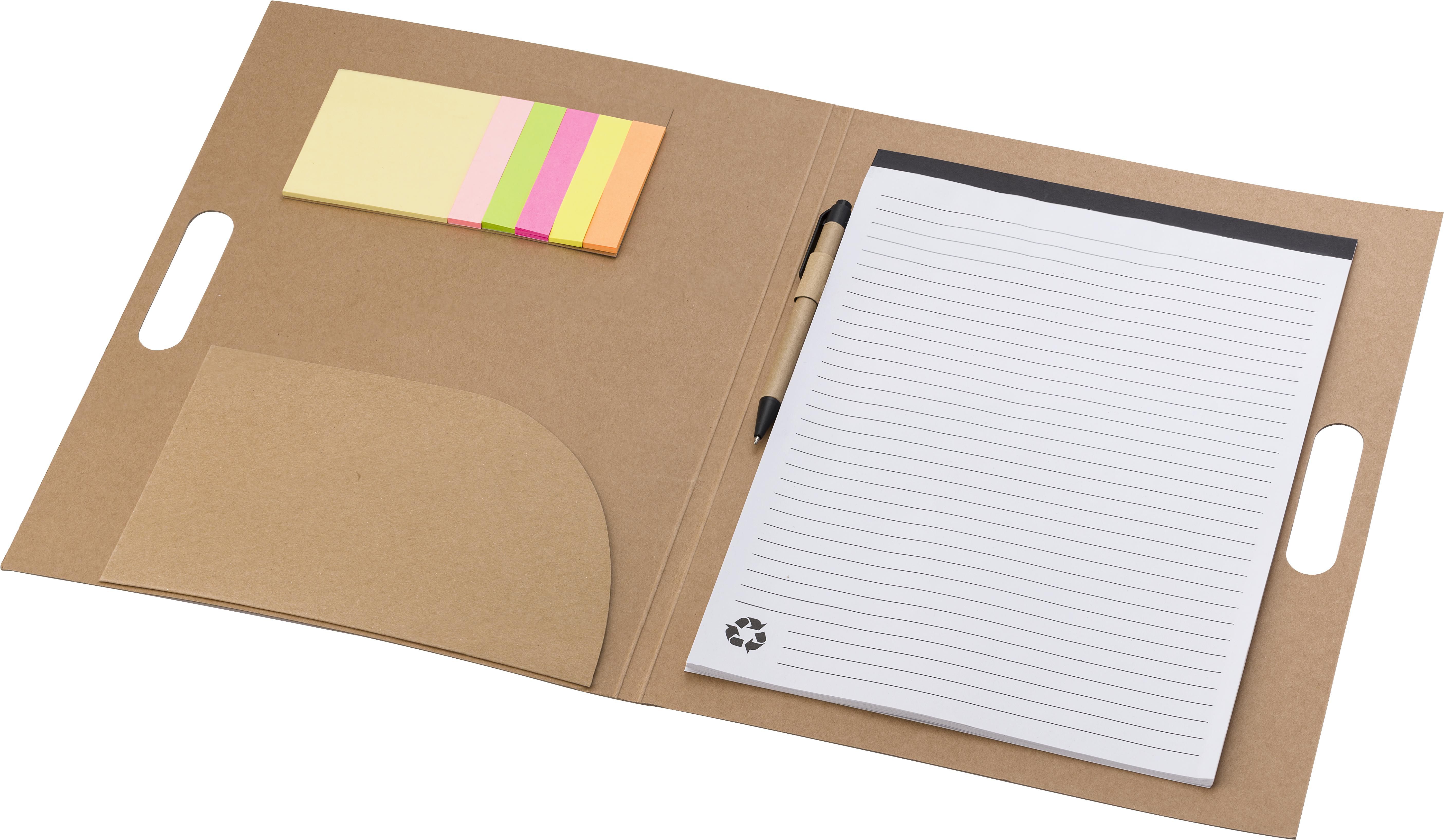 Conférencier en carton livré avec bloc-notes, marque-pages (25 de chaque coloris) et stylo en carton et plastique, mine bleue.