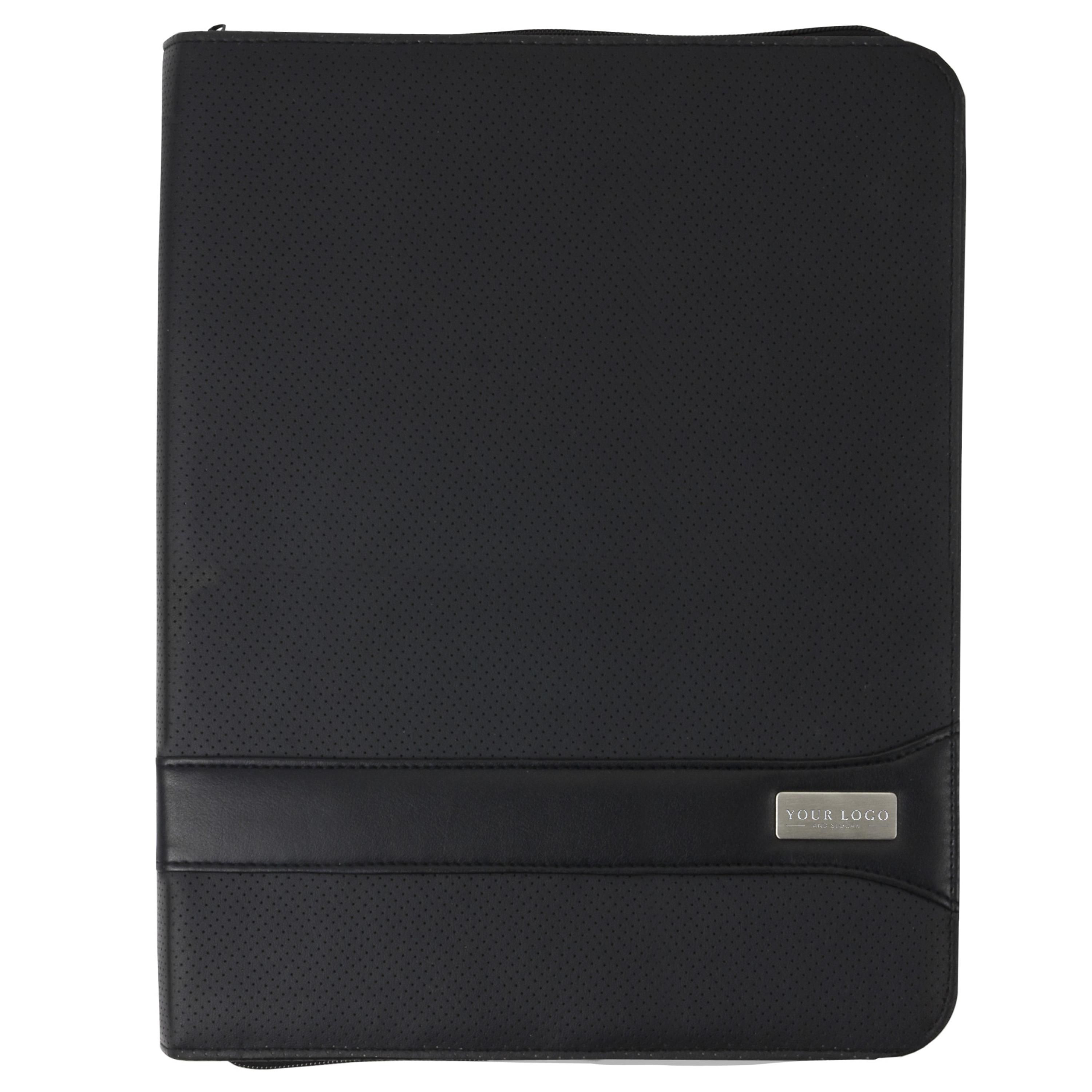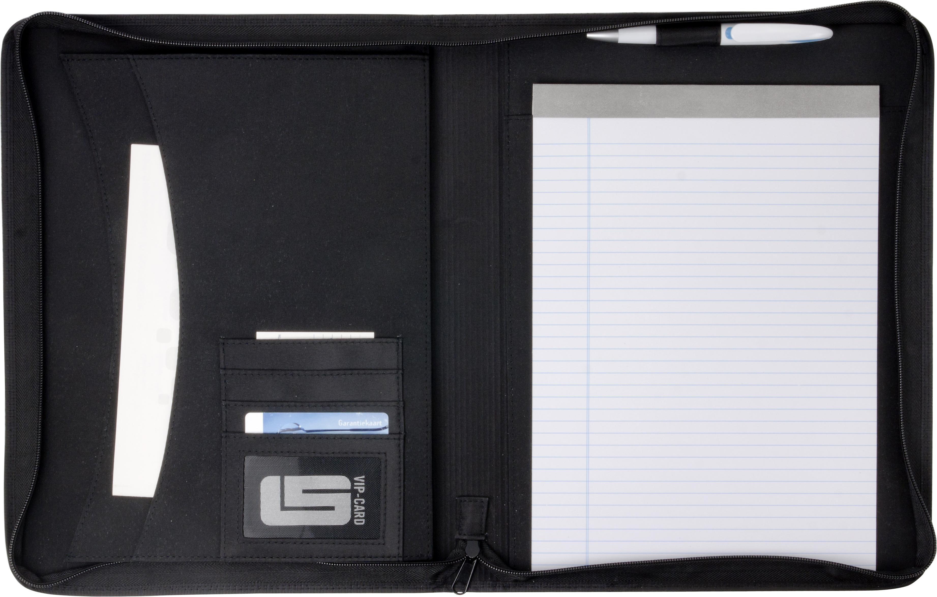 Conférencier A4 zippé en PVC muni d'une plaque métallique, livré avec bloc-notes, sans stylo.