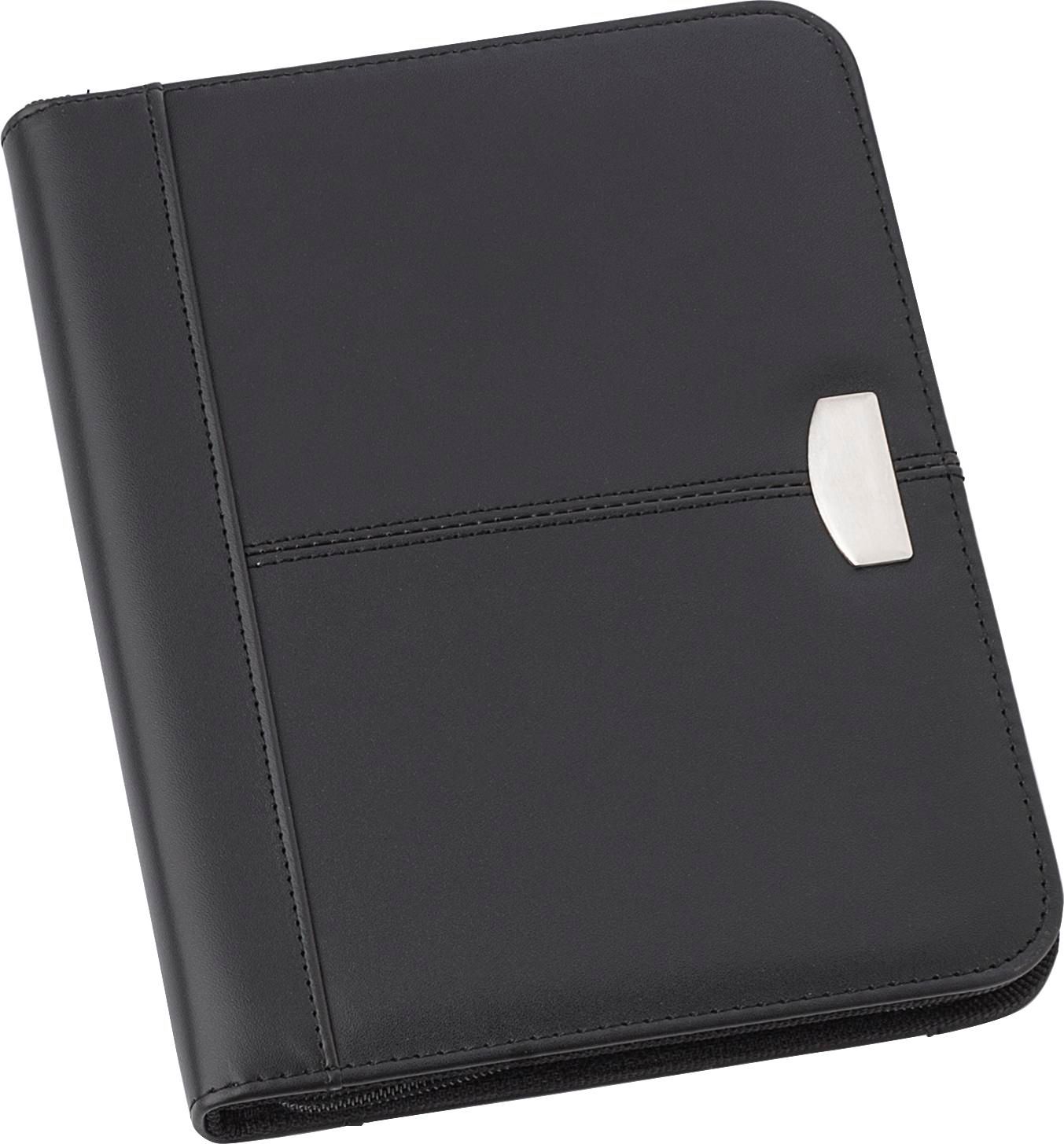 Conférencier A5 zippé en cuir reconstitué (synderme) muni d'une plaque métallique, livré avec bloc-notes, sans stylo.