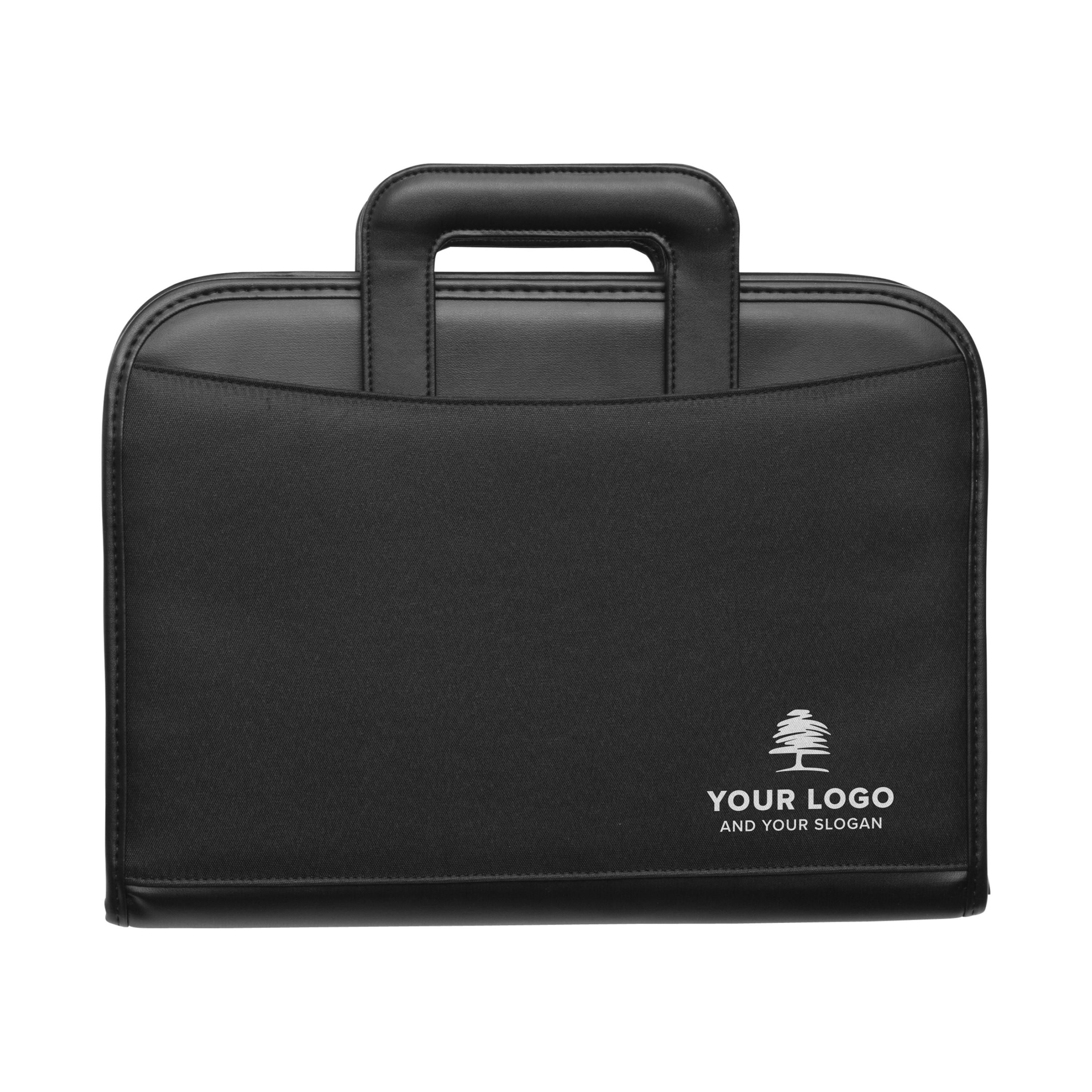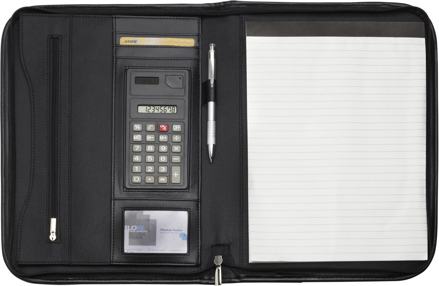 Conférencier zippé en microfibre et PVC avec poignées rétractables, livré avec bloc-notes et calculatrice, sans stylo.
