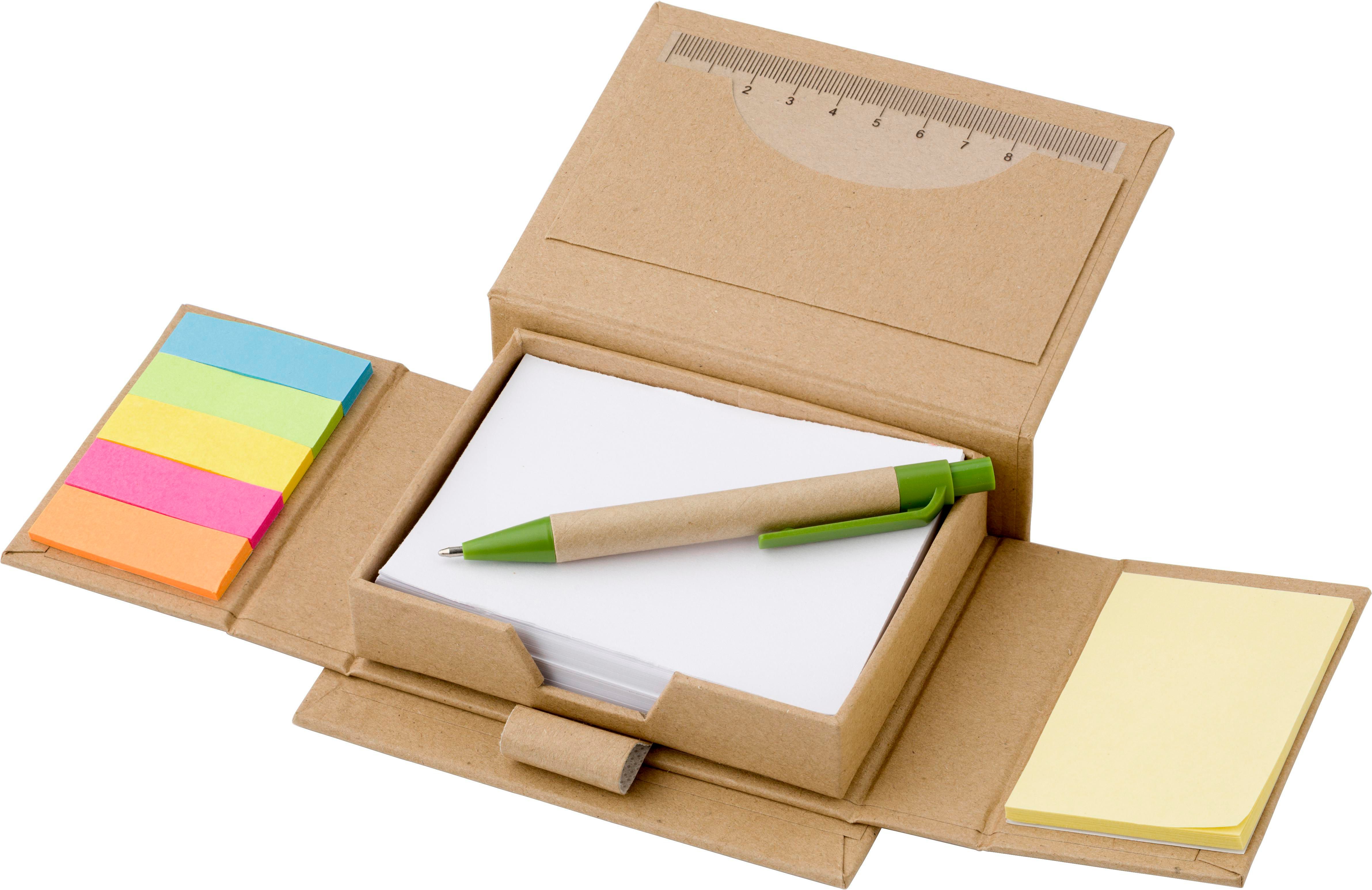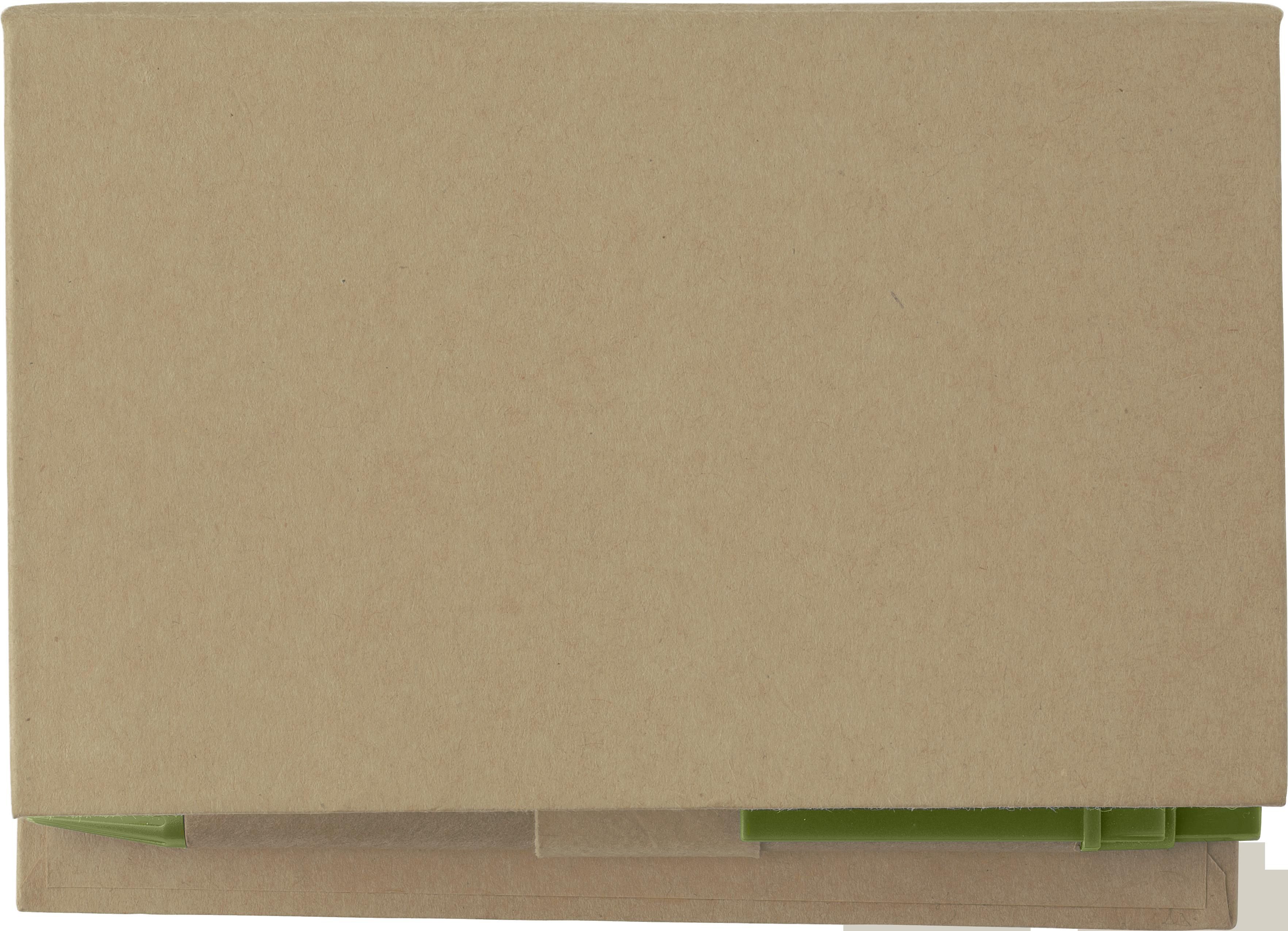 Etui en carton contenant 150 papiers repositionnables de différents coloris, 160 feuillets et un stylo en carton et plastique, mine bleue.