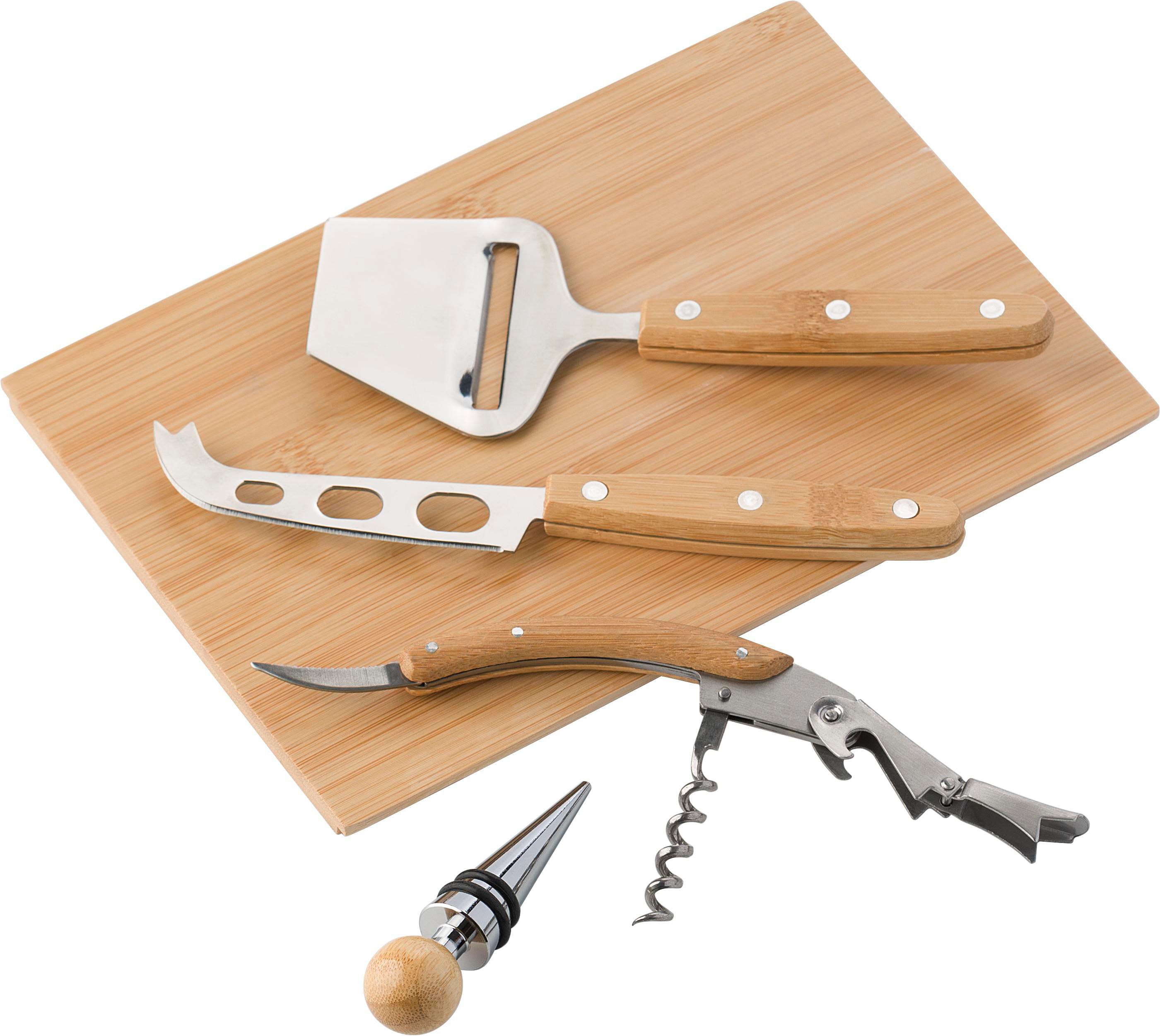 Service à fromage et vin en bambou comprenant tire-bouchon, bouchon à vin, râpe à fromage et couteau.