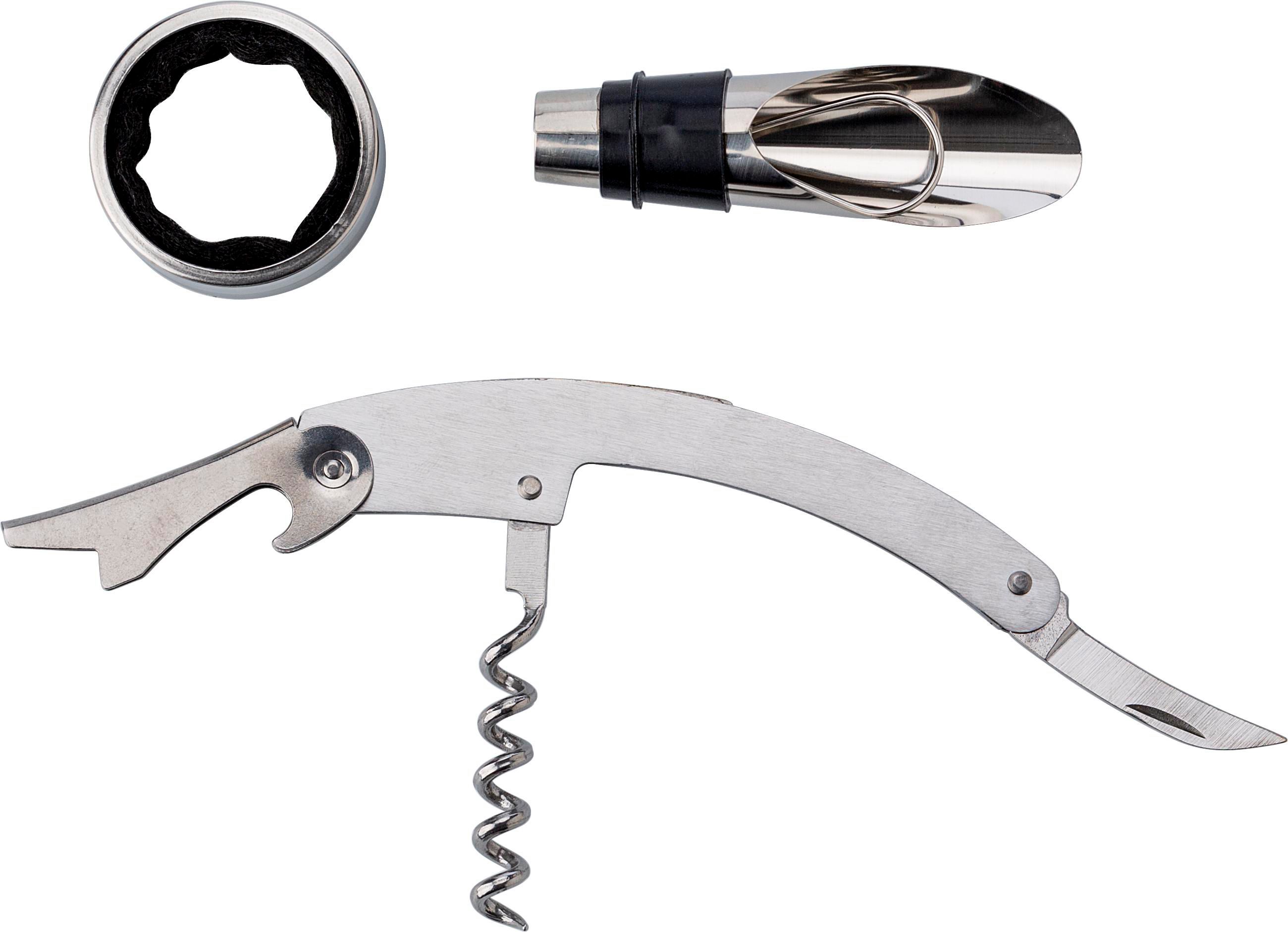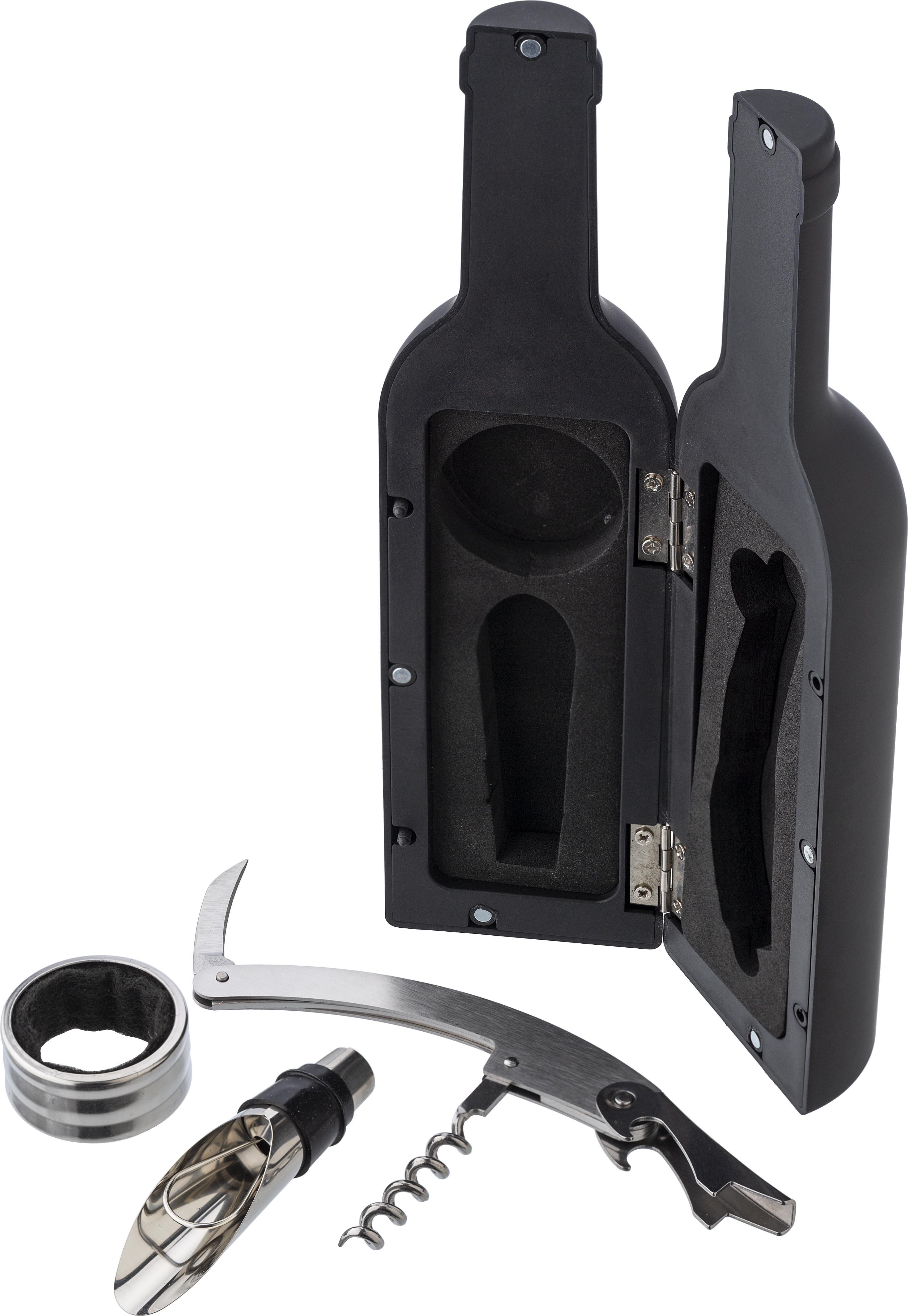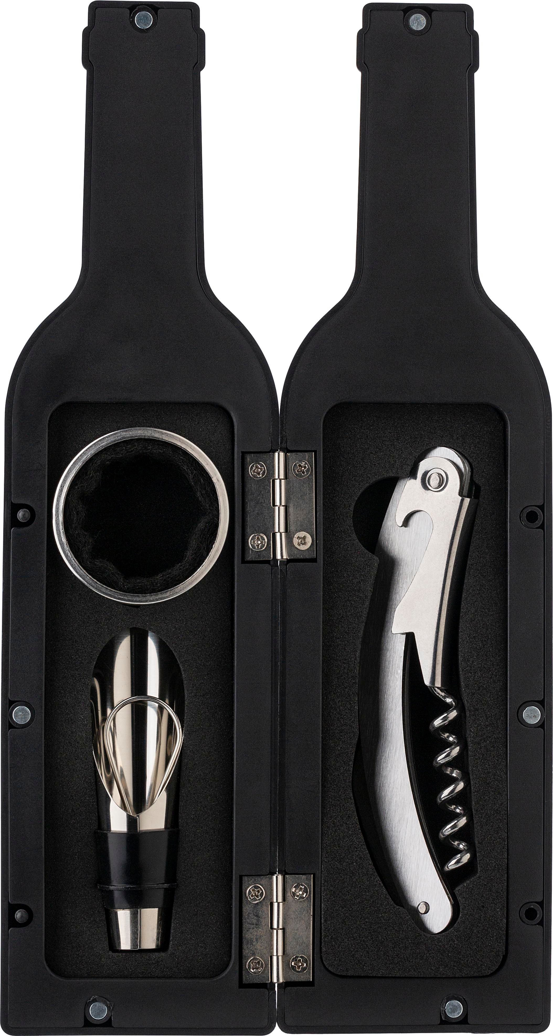 Set à vin en ABS contenant un tire-bouchon, un bec-verseur avec bouchon et un stop-goutte.