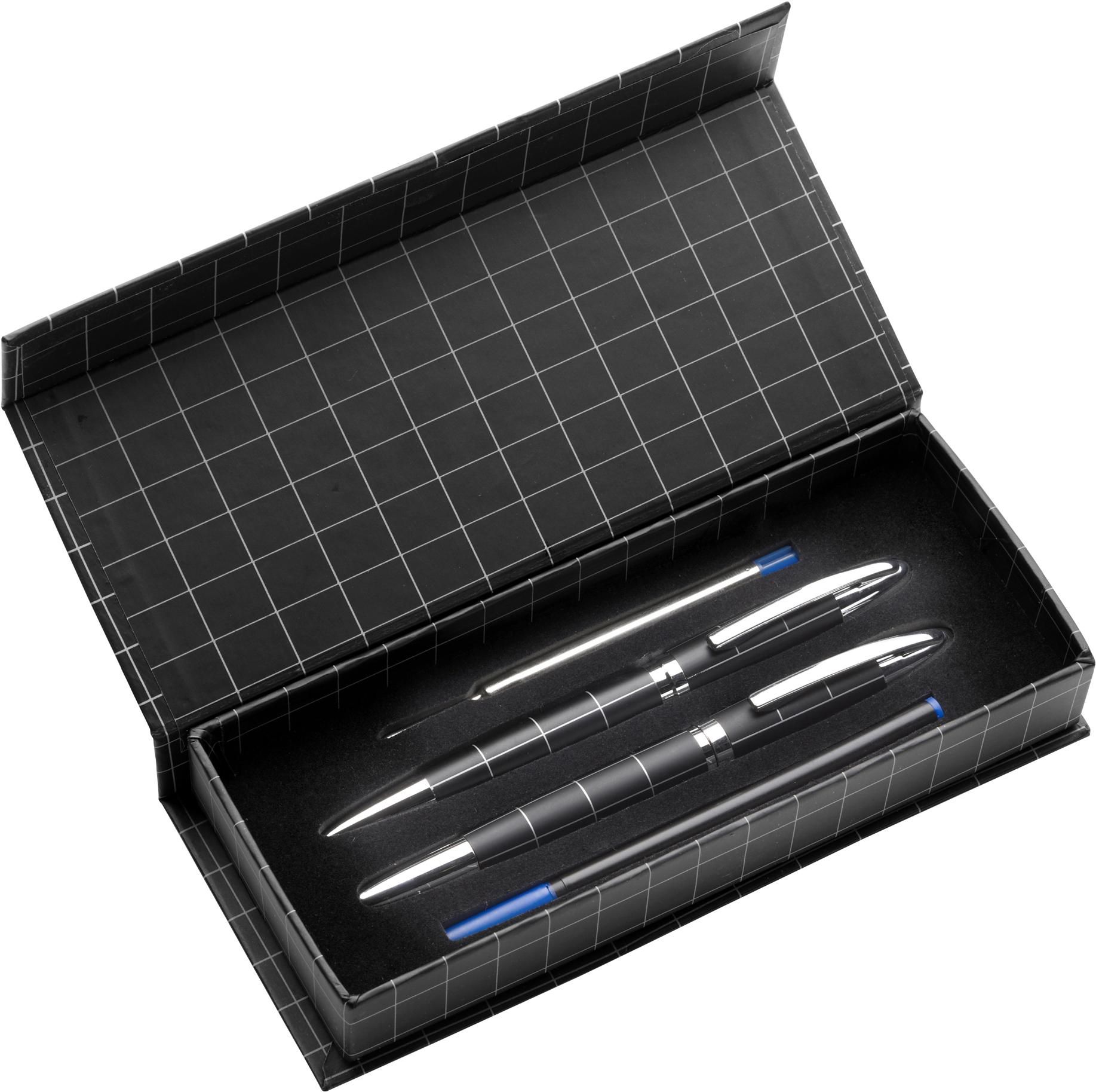 Parure de stylo bille et roller en métal dans un écrin cartonné à fermeture magnétique, livrée avec une mine supplémentaire, mines bleues.