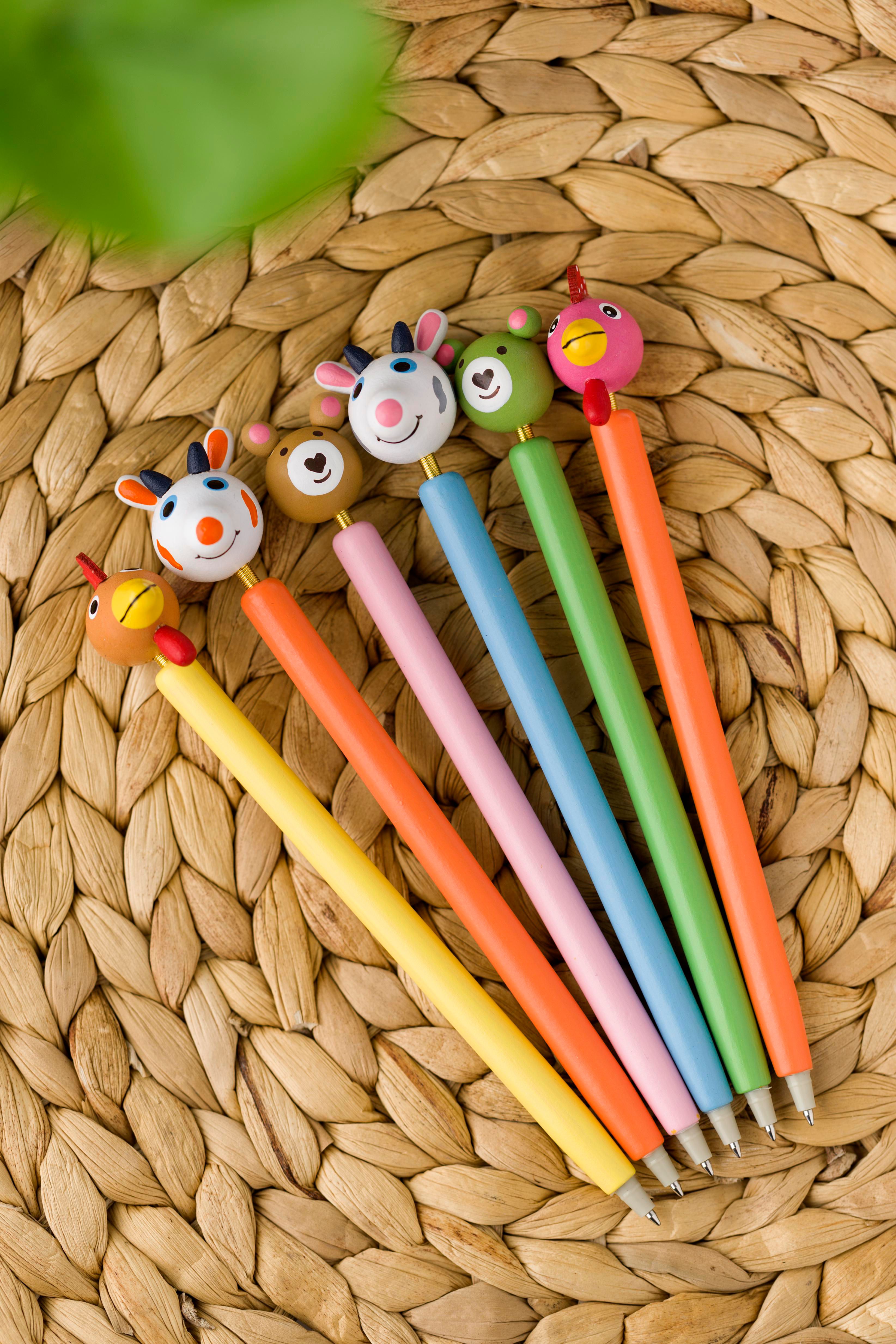 Stylo bille en bois (prix par pce, conditionné et livré par multiple de 24pcs soit 4pcs par modèle, mine bleue.