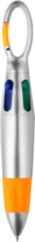 Stylo bille mousqueton en plastique avec embase en gomme muni de 4 mines : rouge, verte, bleue et noire.