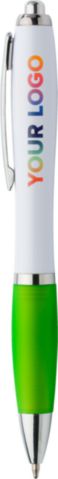Stylo bille en plastique avec embase en gomme et clip en métal, mine bleue.