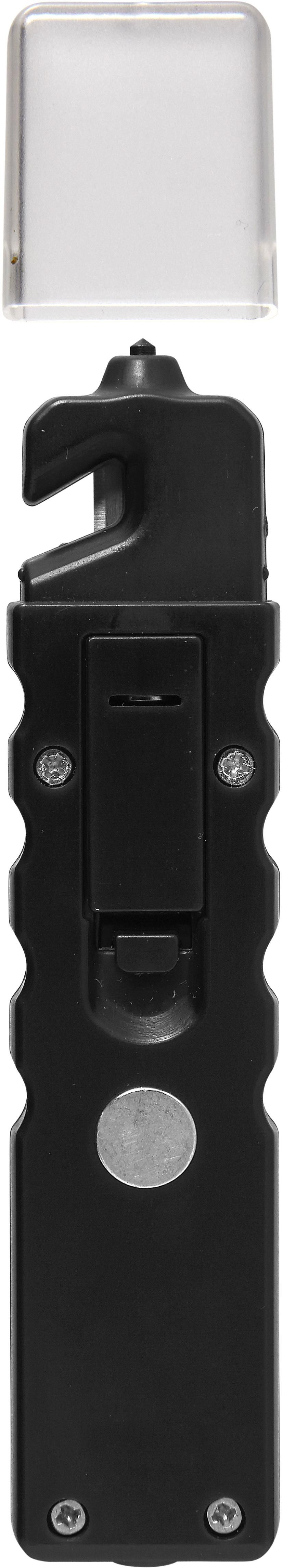 Torche magnétique en métal munie de LEDS COB clignotantes, d'une LED fixe, d'un coupe-ceinture et d'un brise-vitre, piles incluses.
