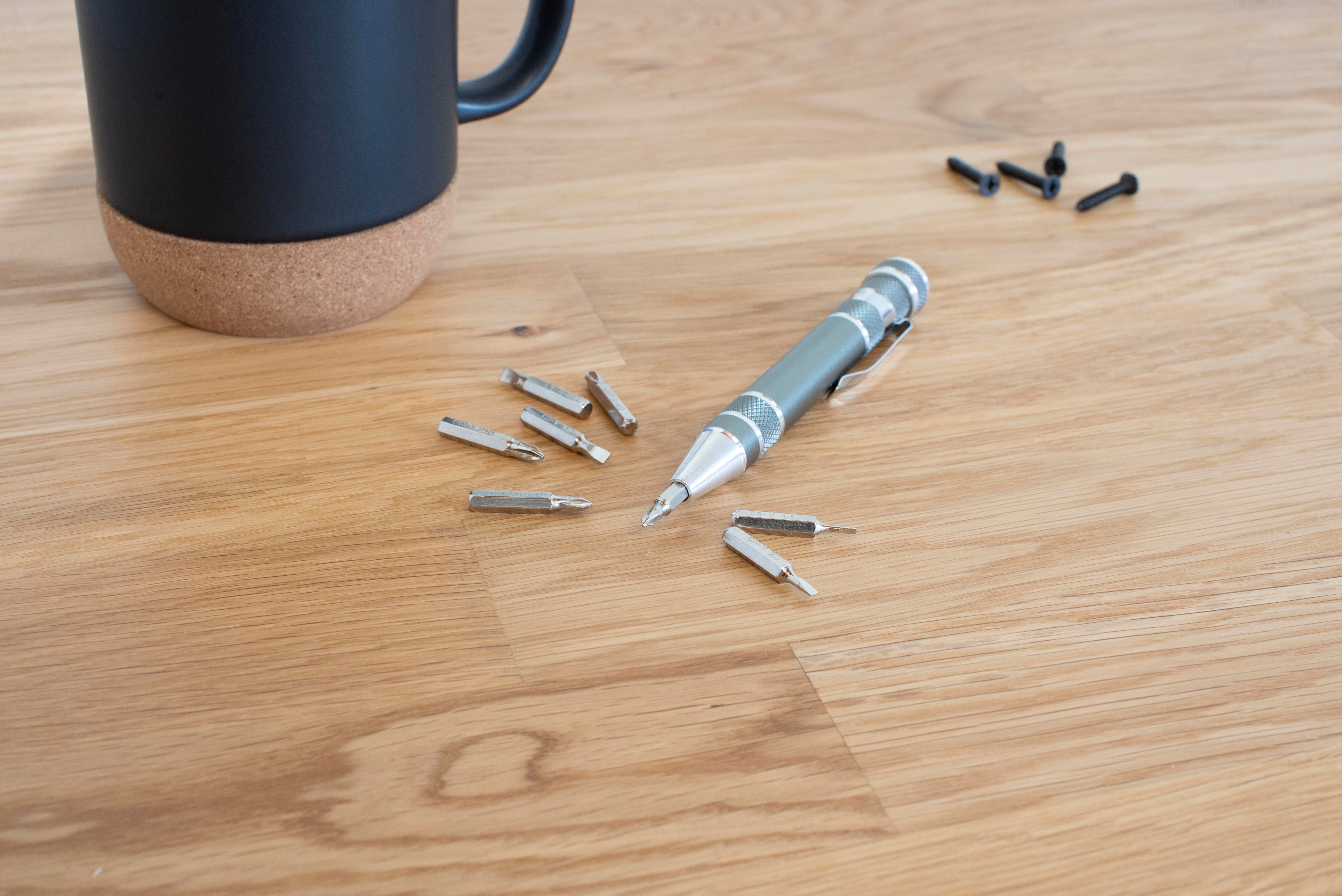 Tournevis en aluminium avec 4 embouts plats et 4 cruciformes.
