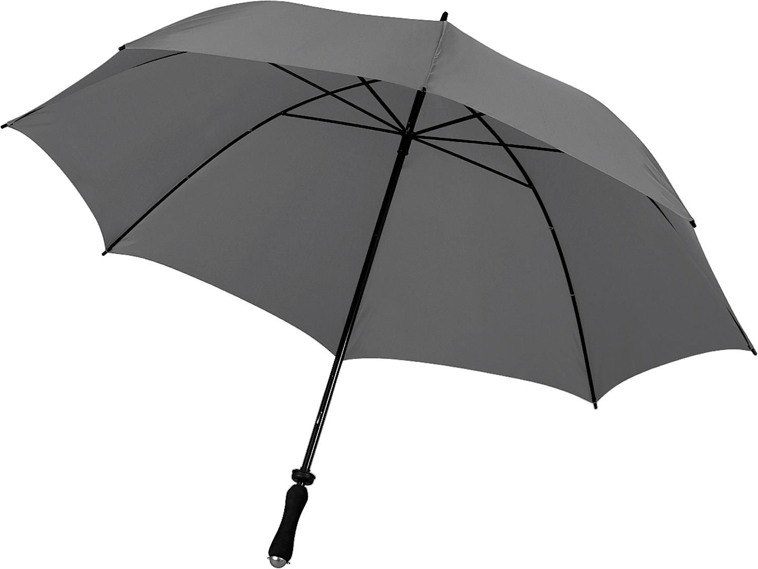 Parapluie grand golf en polyester 190T, mât et double baleinage en métal et manche en EVA livré avec une housse avec bandoulière.