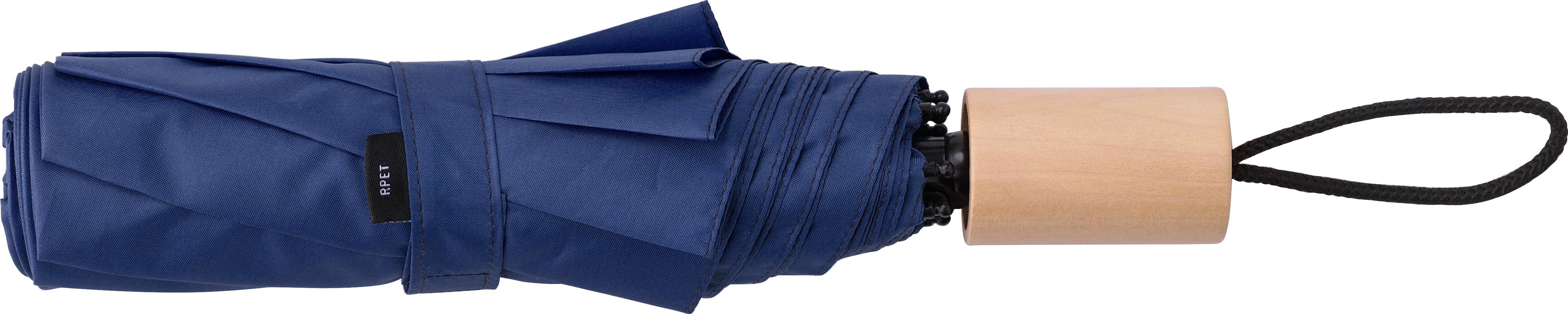 Parapluie pliable en polyester pongée 190T avec fermeture et ouverture manuelles, mât et baleines en métal, manche en bambou, livré avec une housse.