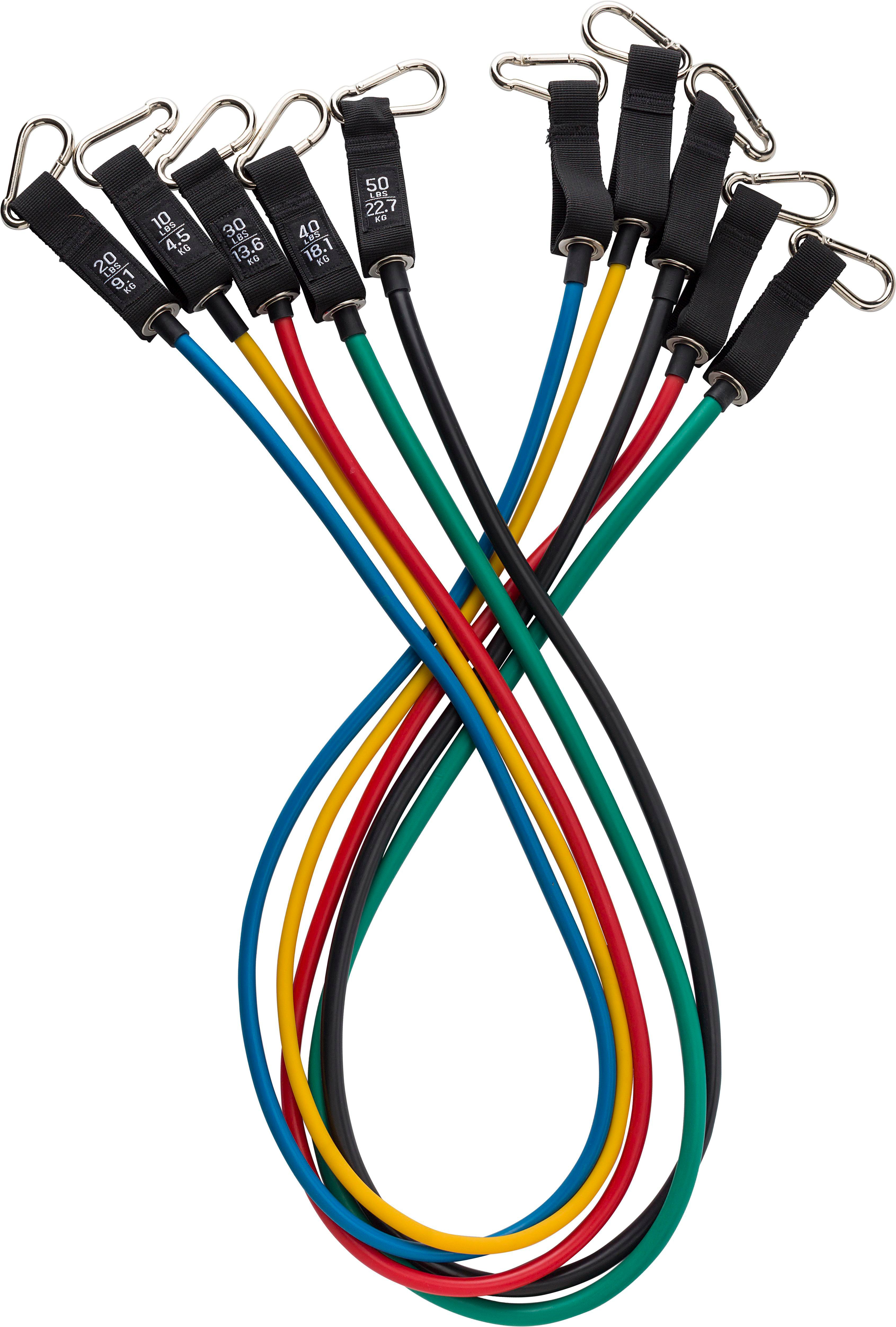 Set composé de 5 sangles de tonification en polyester 210D de différentes résistances livrées dans un sac de transport.