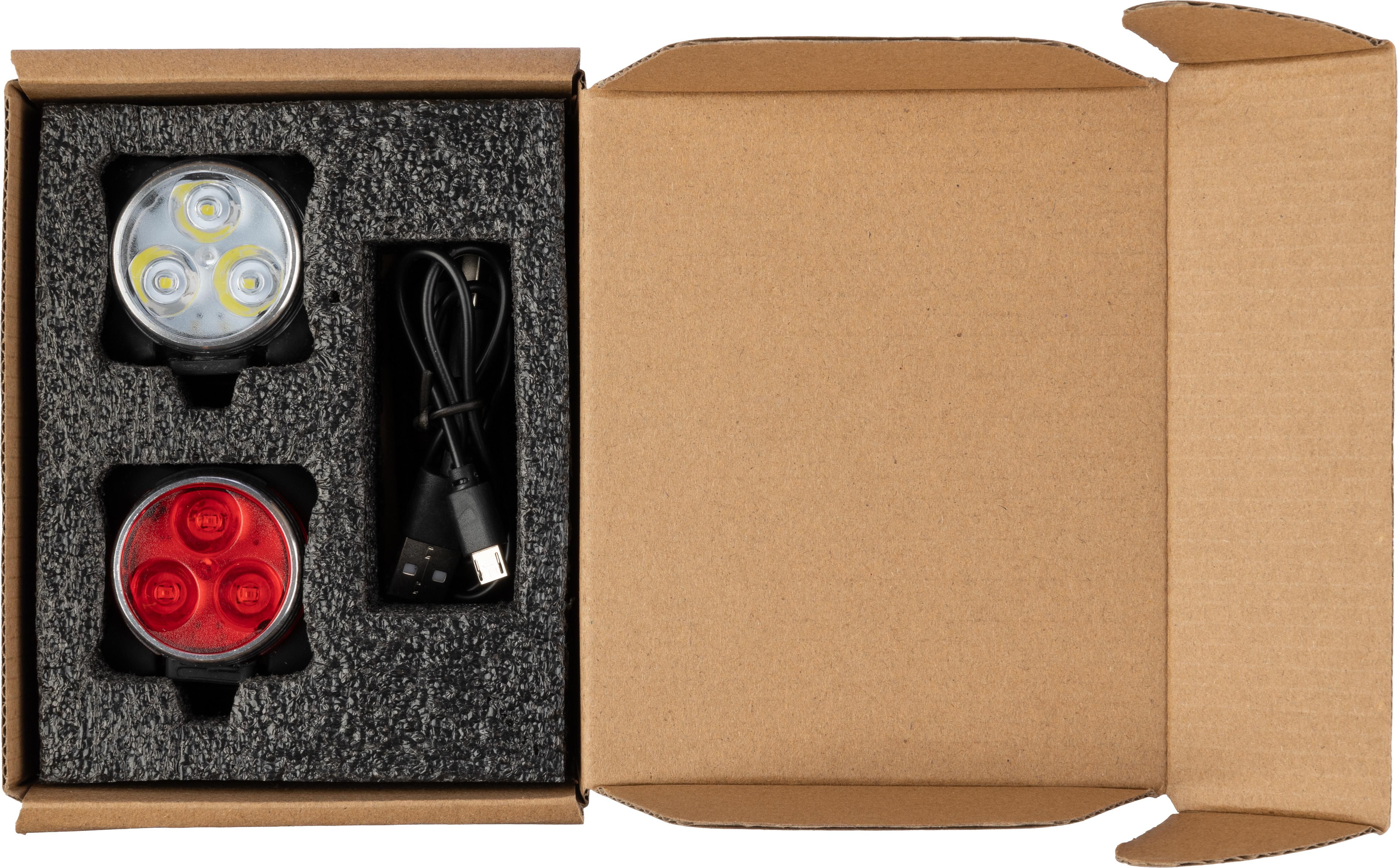 Set rechargeable d’une puissance de 650 mAh en ABS et silicone composé de lampes avant et arrière munies de 3 LEDS de 4 modes d’éclairage dans une boîte cadeau kraft.