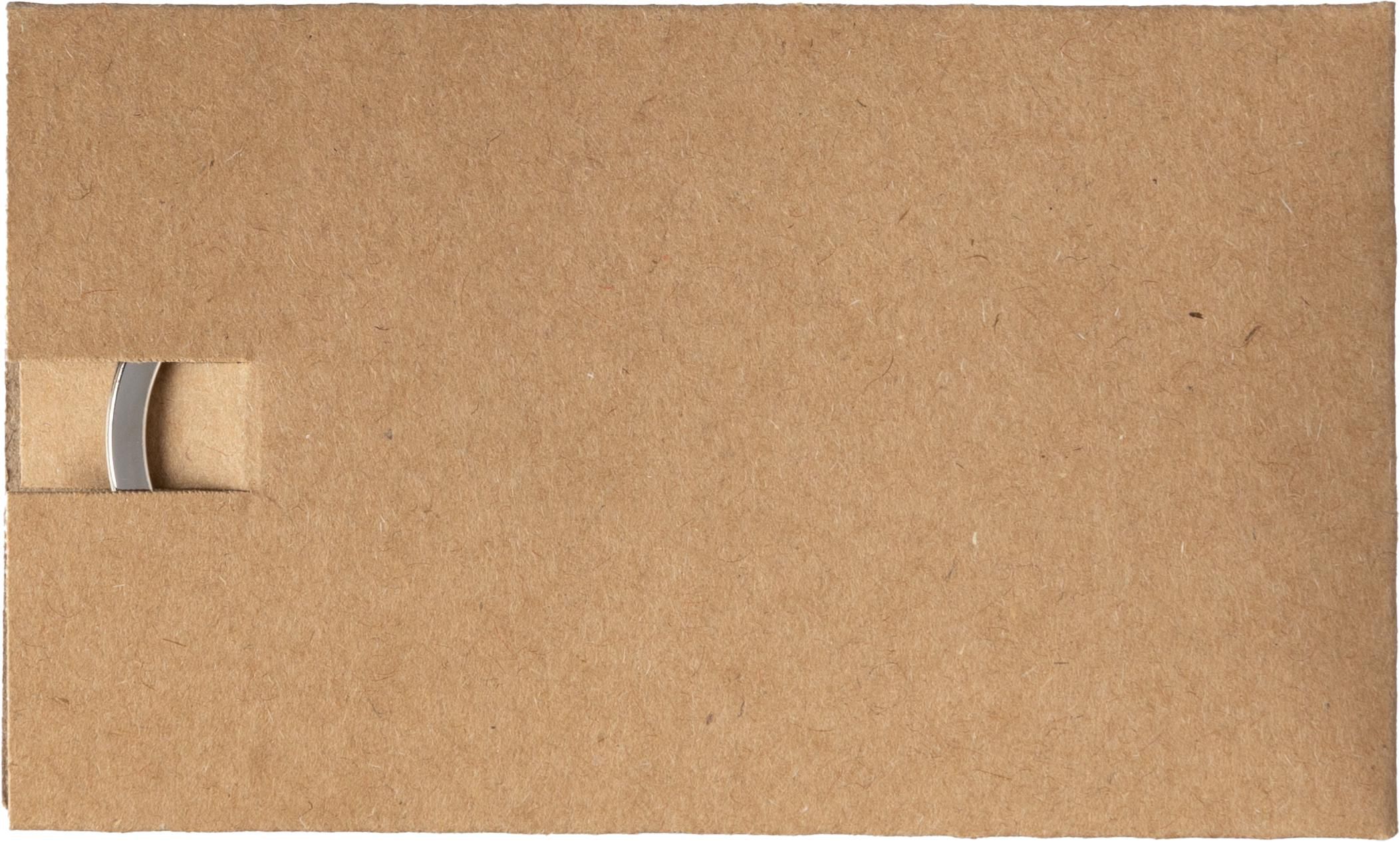 Porte-clés en zinc et bambou en forme de voiture dans une pochette cadeau kraft.