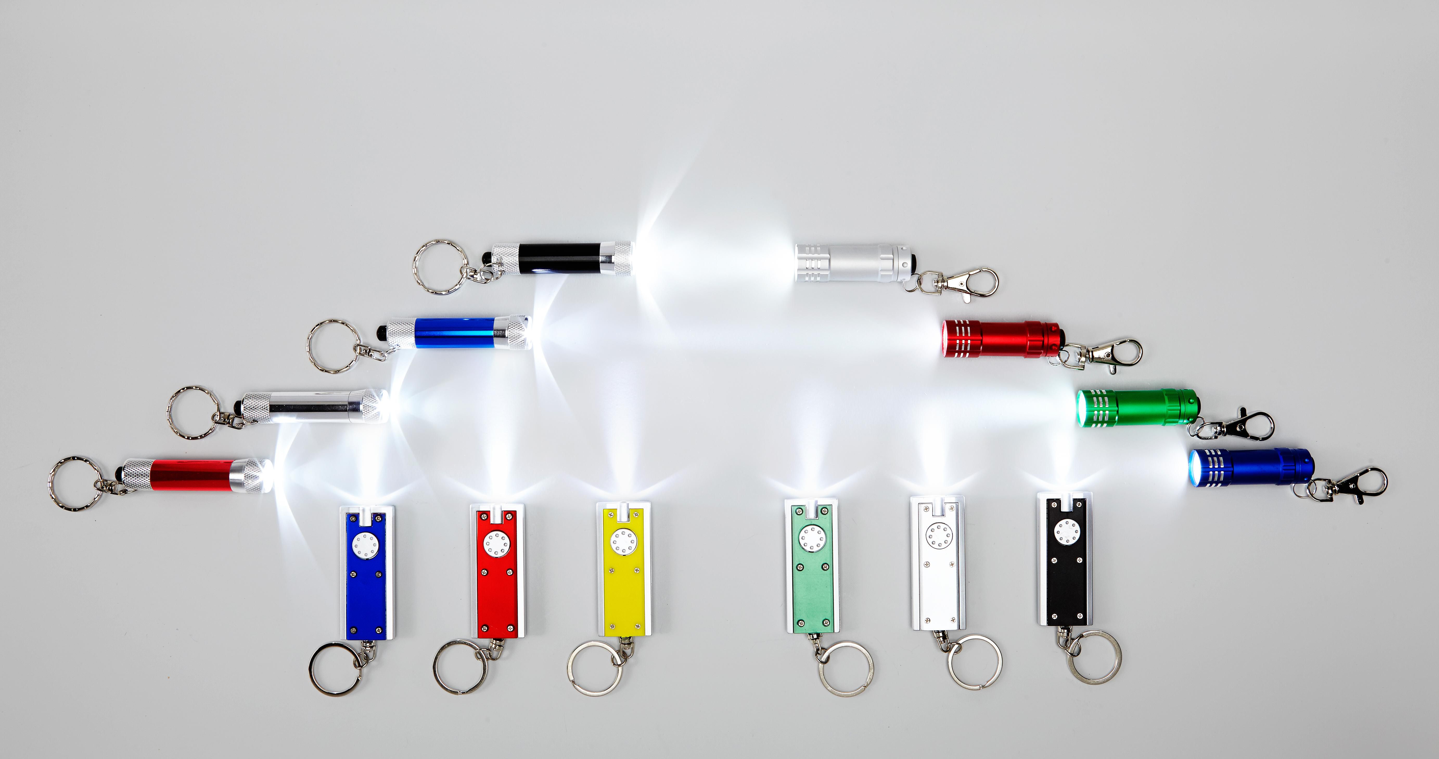 Porte-clés torche en métal muni d'une LED blanche, piles incluses.