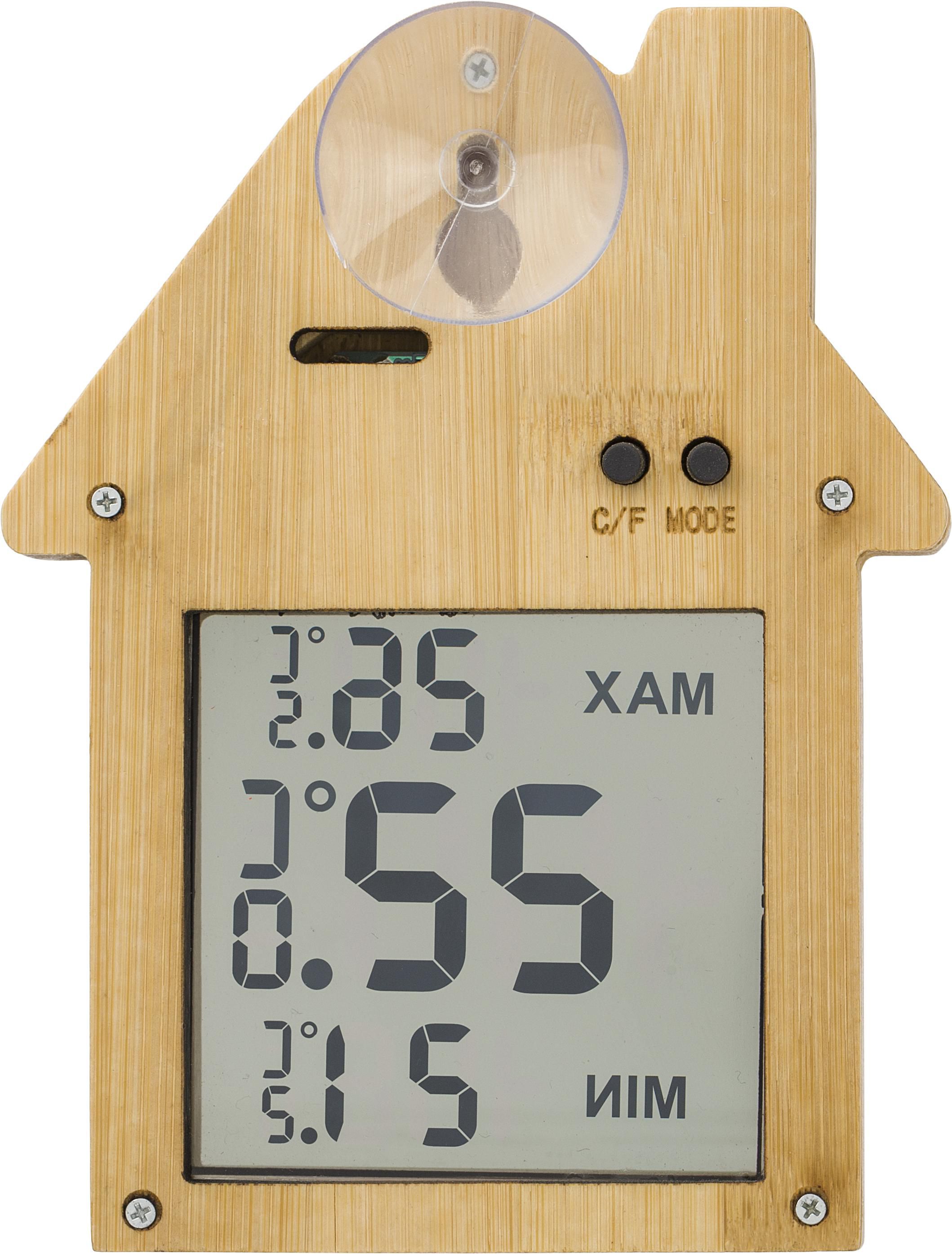 Station météo en bambou avec ventouse avec fonctions température courante et températures minimales et maximales dans une boîte cadeau kraft, piles incluses.