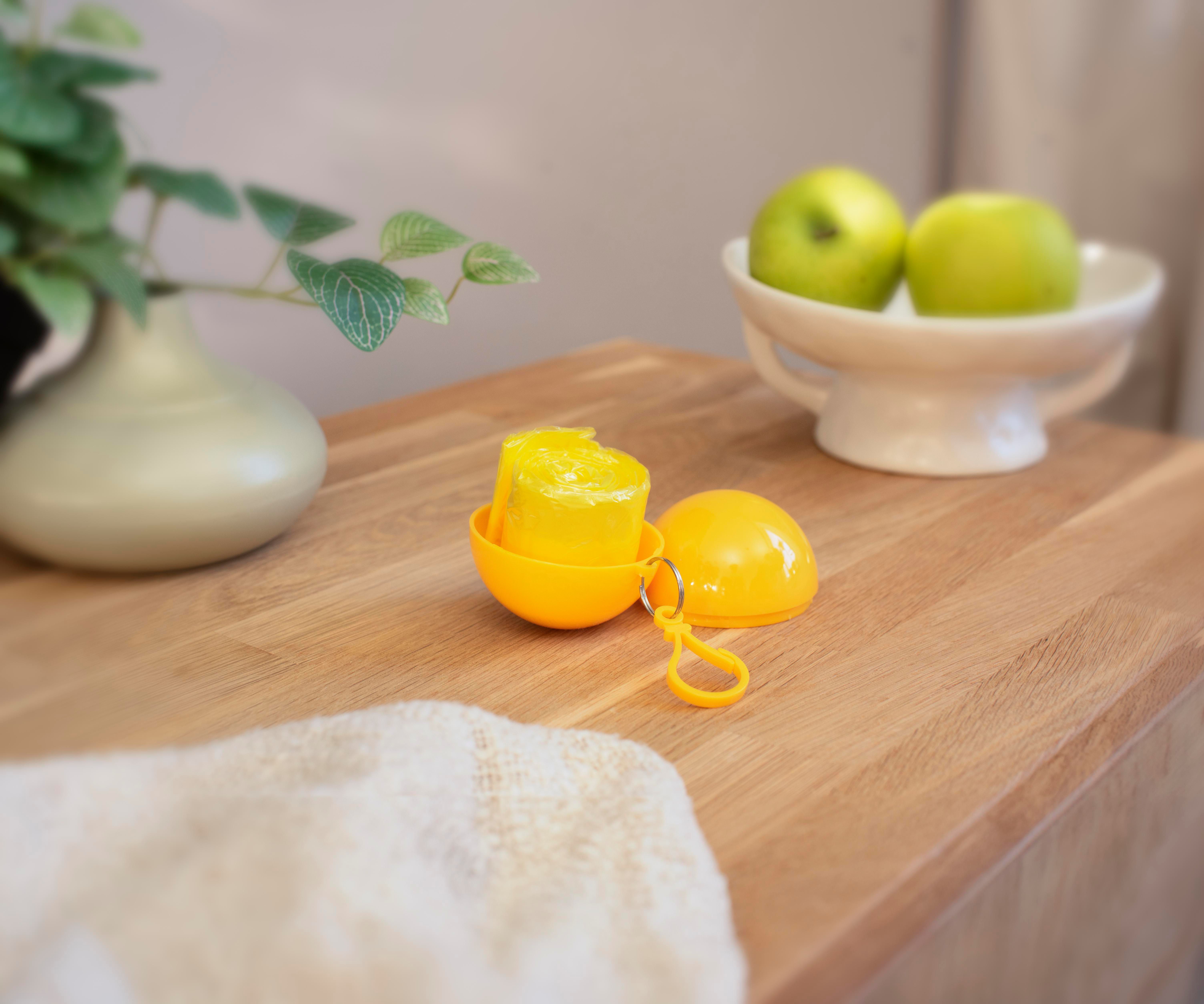 Etui boule contenant un poncho assorti à la couleur de l'étui.