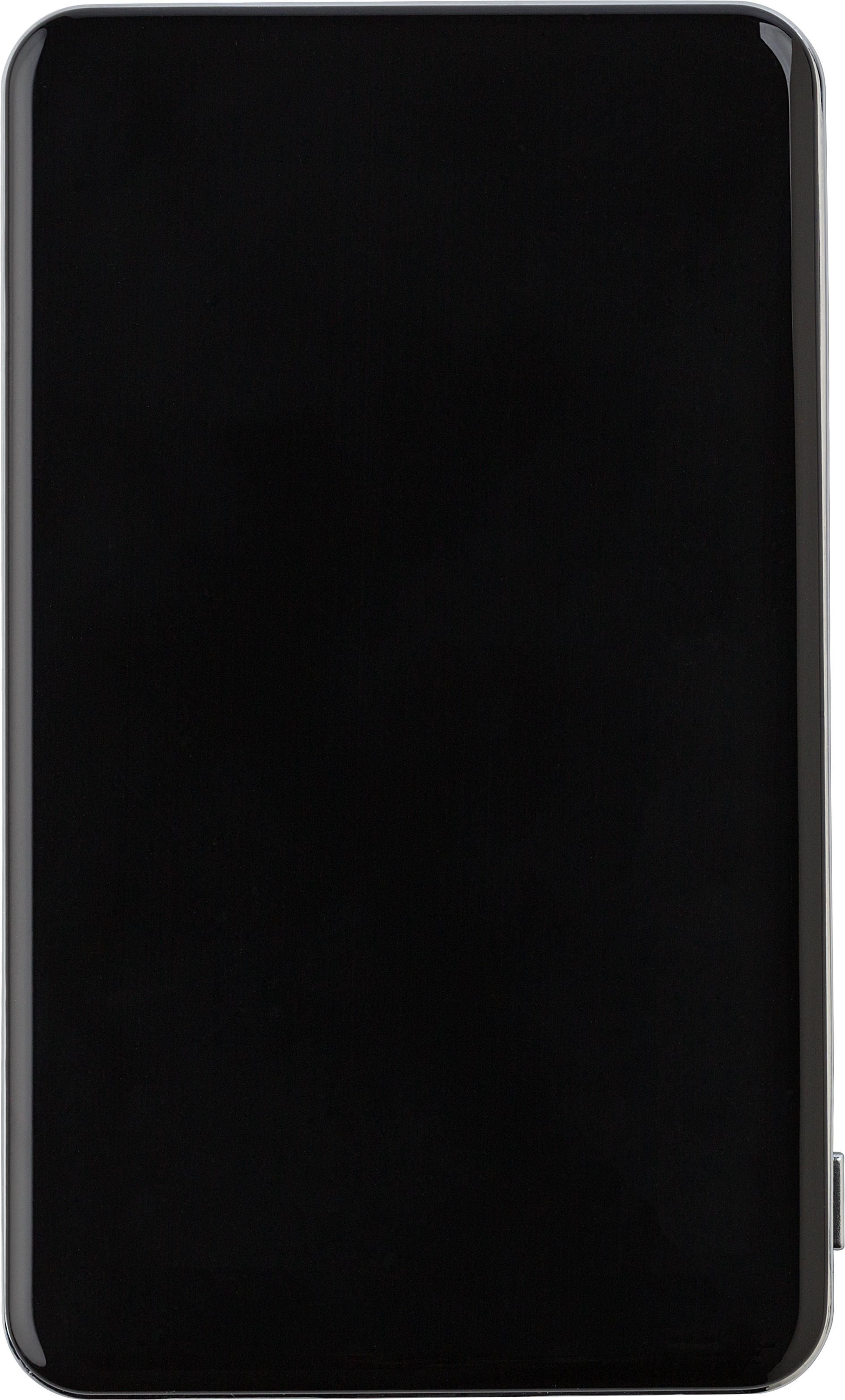 Chargeur en ABS équipé d'une batterie Li-polymère d'une capacité de 5 000 mAh, une entrée de 5V/1A, et 2 sorties de 1A/2.1/A/5V. équipée de témoin de charge et livrée avec câble de charge.