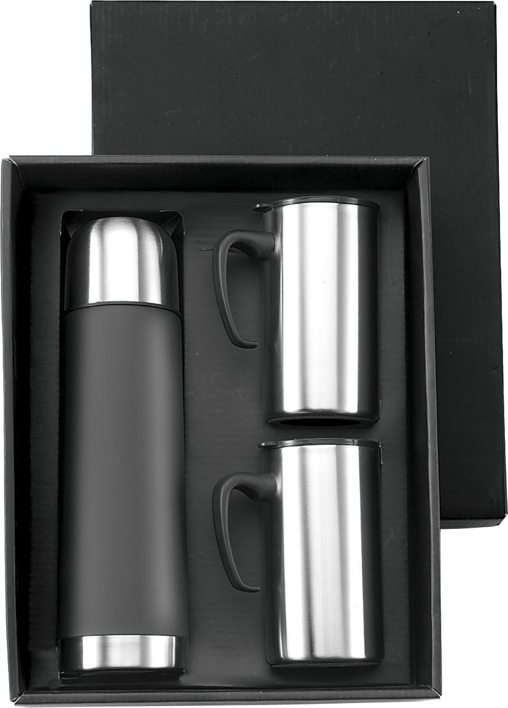 Boîte cadeau contenant une bouteille isotherme double paroi en acier inoxydable d'une contenance de 50cl et 2 mugs de 30 cl en acier inoxydable.
